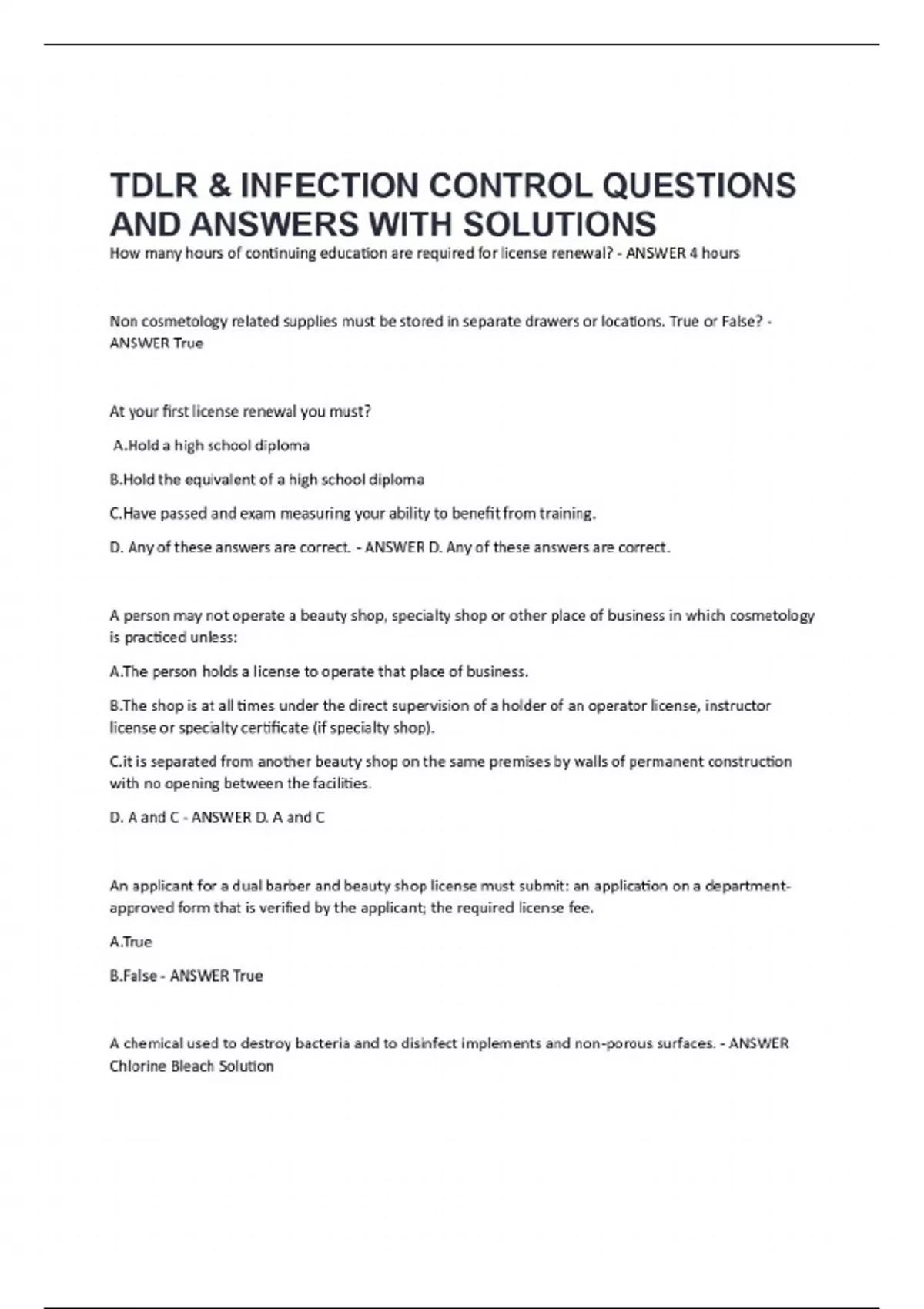 TDLR & INFECTION CONTROL QUESTIONS AND ANSWERS WITH SOLUTIONS 2025