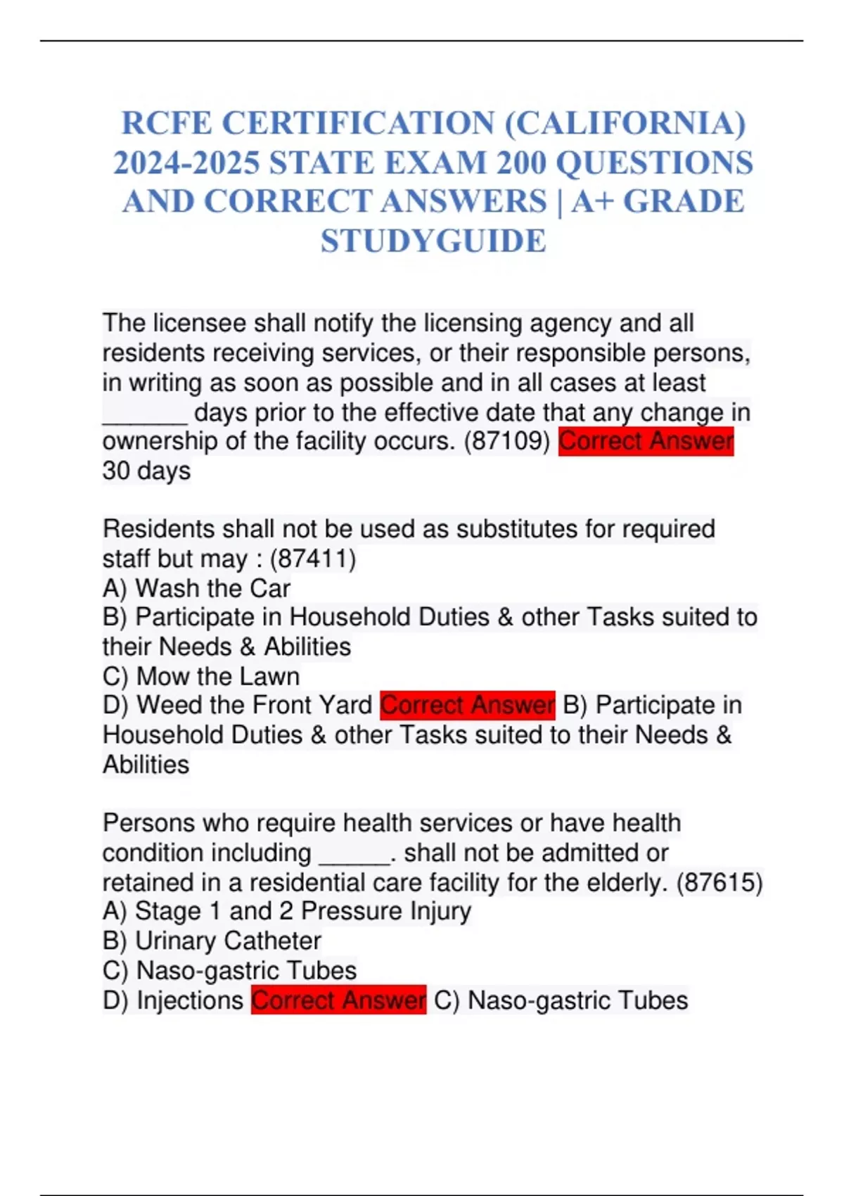 RCFE CERTIFICATION (CALIFORNIA) STATE EXAM 200 QUESTIONS AND CORRECT ANSWERS | A+ GRADE STUDYGUIDE