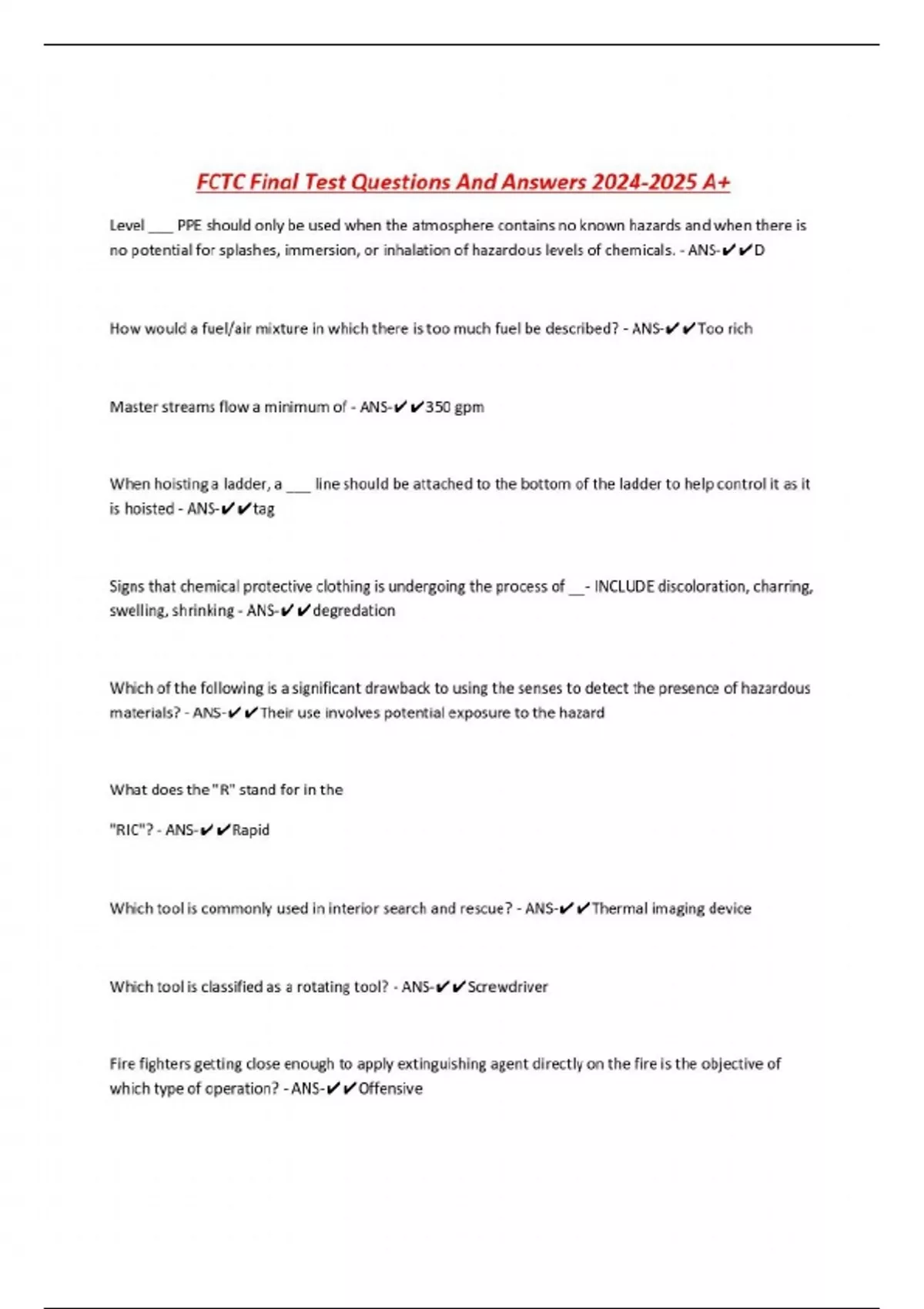 FCTC Final Test Questions And Answers A+ Level ___ PPE should only be used when the atmosphere contains no known hazards and when there is no potential for splashes, immersion, or inhalation of hazardous levels of chemicals. - ANS-D How would a fuel/air mixture in which there is too much fuel be described? - ANS-Too rich Master streams flow a minimum of - ANS-350 gpm When hoisting a ladder, a ___ line should be attached to the bottom of the ladder to help control it as it is hoisted - ANS-tag Signs that chemical protective clothing is undergoing the process of __- INCLUDE discoloration, charring, swelling, shrinking - ANS-degredation Which of the following is a significant drawback to using the senses to detect the presence of hazardous materials? - ANS-Their use involves potential exposure to the hazard What does the "R" stand for in the "RIC"? - ANS-Rapid Which tool is commonly used in interior search and rescue? - ANS-Thermal imaging device Which tool is classified as a rotating tool? - ANS-Screwdriver Fire fighters getting close enough to apply extinguishing agent directly on the fire is the objective of which type of operation? - ANS-Offensive CONTINUES...