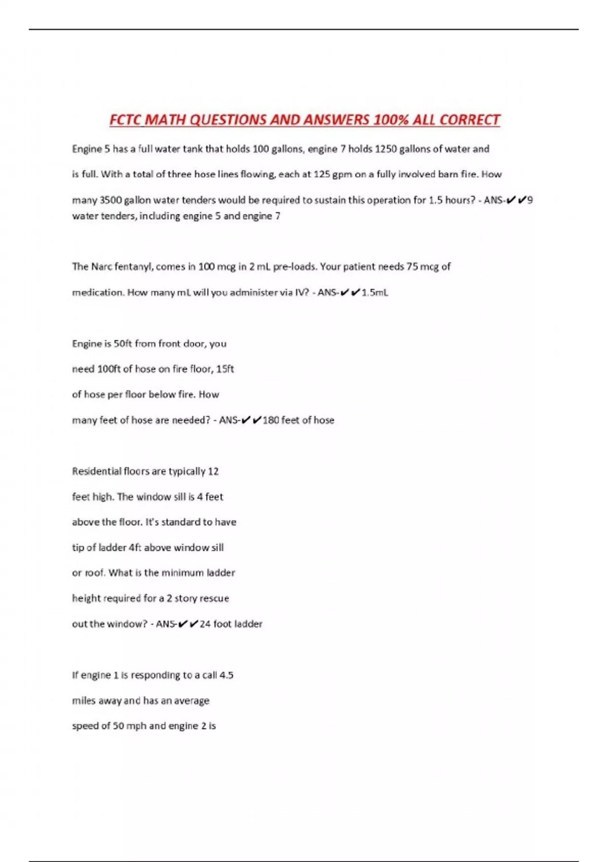 FCTC MATH QUESTIONS AND ANSWERS 100% ALL CORRECT Engine 5 has a full water tank that holds 100 gallons, engine 7 holds 1250 gallons of water and is full. With a total of three hose lines flowing, each at 125 gpm on a fully involved barn fire. How many 3500 gallon water tenders would be required to sustain this operation for 1.5 hours? - ANS-9 water tenders, including engine 5 and engine 7 The Narc fentanyl, comes in 100 mcg in 2 mL pre-loads. Your patient needs 75 mcg of medication. How many mL will you administer via IV? - ANS-1.5mL Engine is 50ft from front door, you need 100ft of hose on fire floor, 15ft of hose per floor below fire. How many feet of hose are needed? - ANS-180 feet of hose Residential floors are typically 12 feet high. The window sill is 4 feet above the floor. It's standard to have tip of ladder 4ft above window sill or roof. What is the minimum ladder height required for a 2 story rescue out the window? - ANS-24 foot ladder If engine 1 is responding to a call 4.5