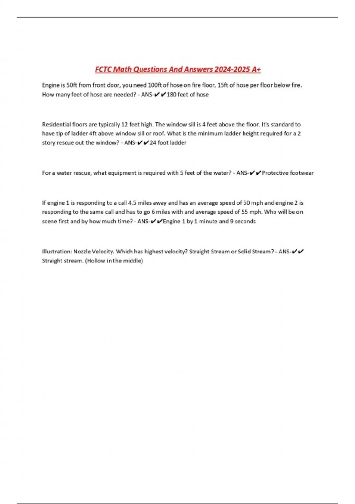 FCTC Math Questions And Answers A+ Engine is 50ft from front door, you need 100ft of hose on fire floor, 15ft of hose per floor below fire. How many feet of hose are needed? - ANS-180 feet of hose Residential floors are typically 12 feet high. The window sill is 4 feet above the floor. It's standard to have tip of ladder 4ft above window sill or roof. What is the minimum ladder height required for a 2 story rescue out the window? - ANS-24 foot ladder For a water rescue, what equipment is required with 5 feet of the water? - ANS-Protective footwear If engine 1 is responding to a call 4.5 miles away and has an average speed of 50 mph and engine 2 is responding to the same call and has to go 6 miles with and average speed of 55 mph. Who will be on scene first and by how much time? - AN