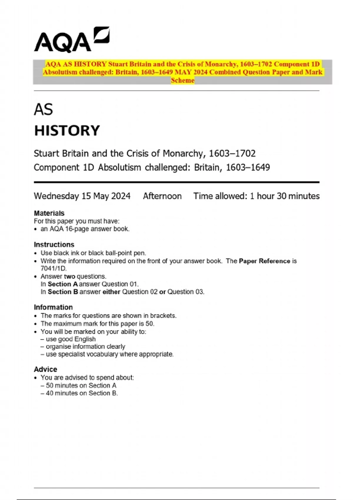 AQA AS HISTORY Stuart Britain and the Crisis of Monarchy, 1603–1702 Component 1D Absolutism challenged: Britain, 1603–1649 MAY 2024 Combined Question Paper and Mark Scheme