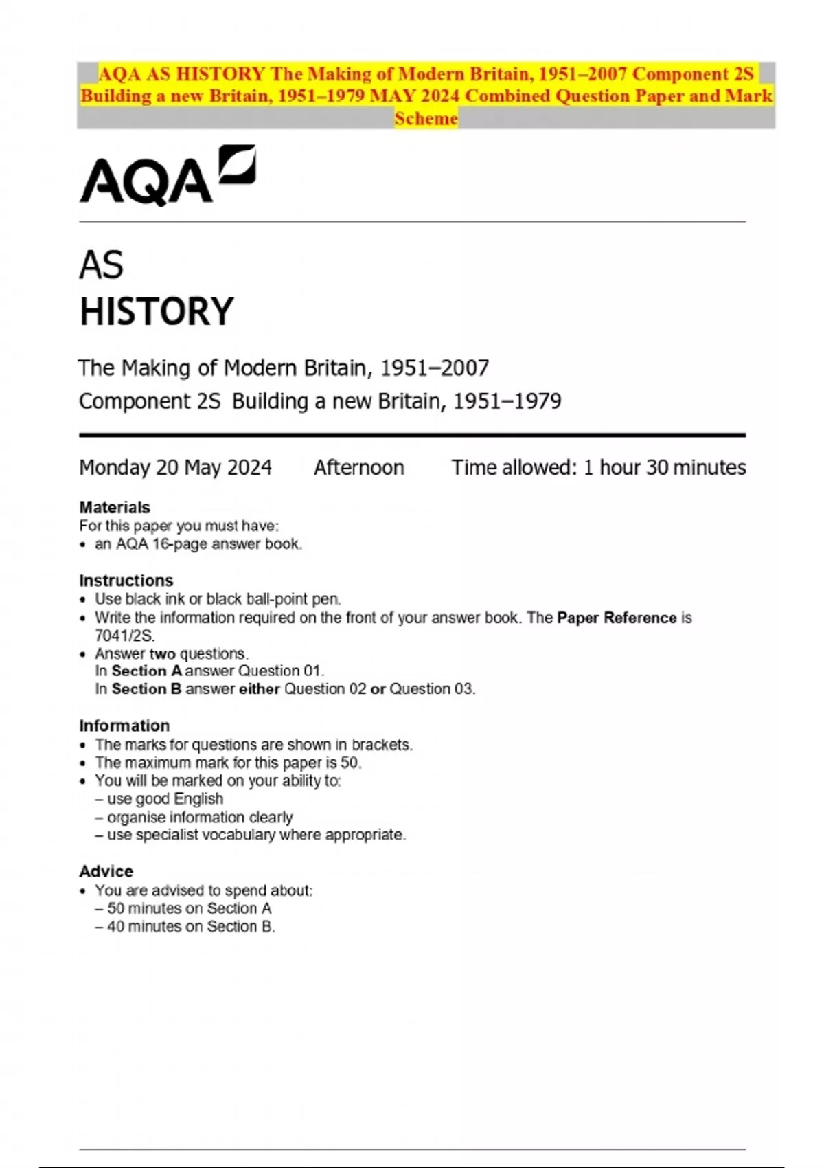 AQA AS HISTORY The Making of Modern Britain, 1951–2007 Component 2S Building a new Britain, 1951–1979 MAY 2024 Combined Question Paper and Mark Scheme