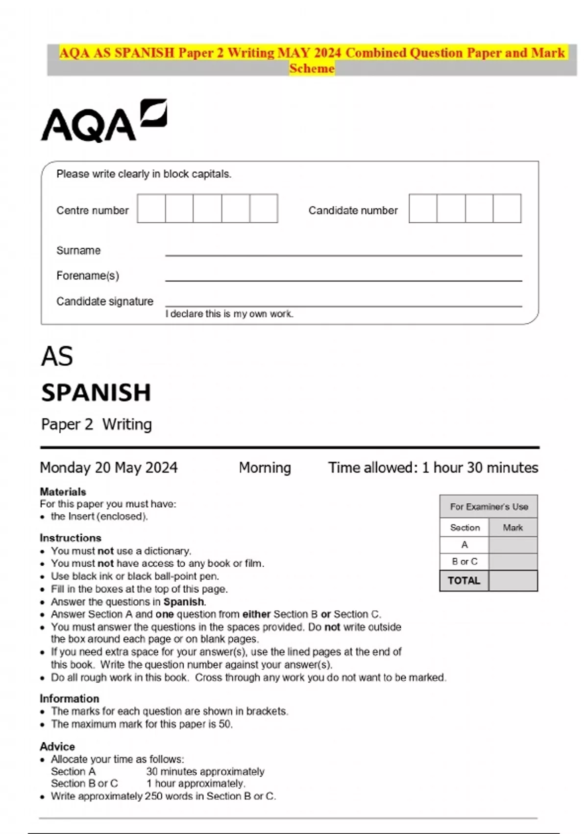 AQA AS SPANISH Paper 2 Writing MAY 2024 Combined Question Paper and Mark Scheme