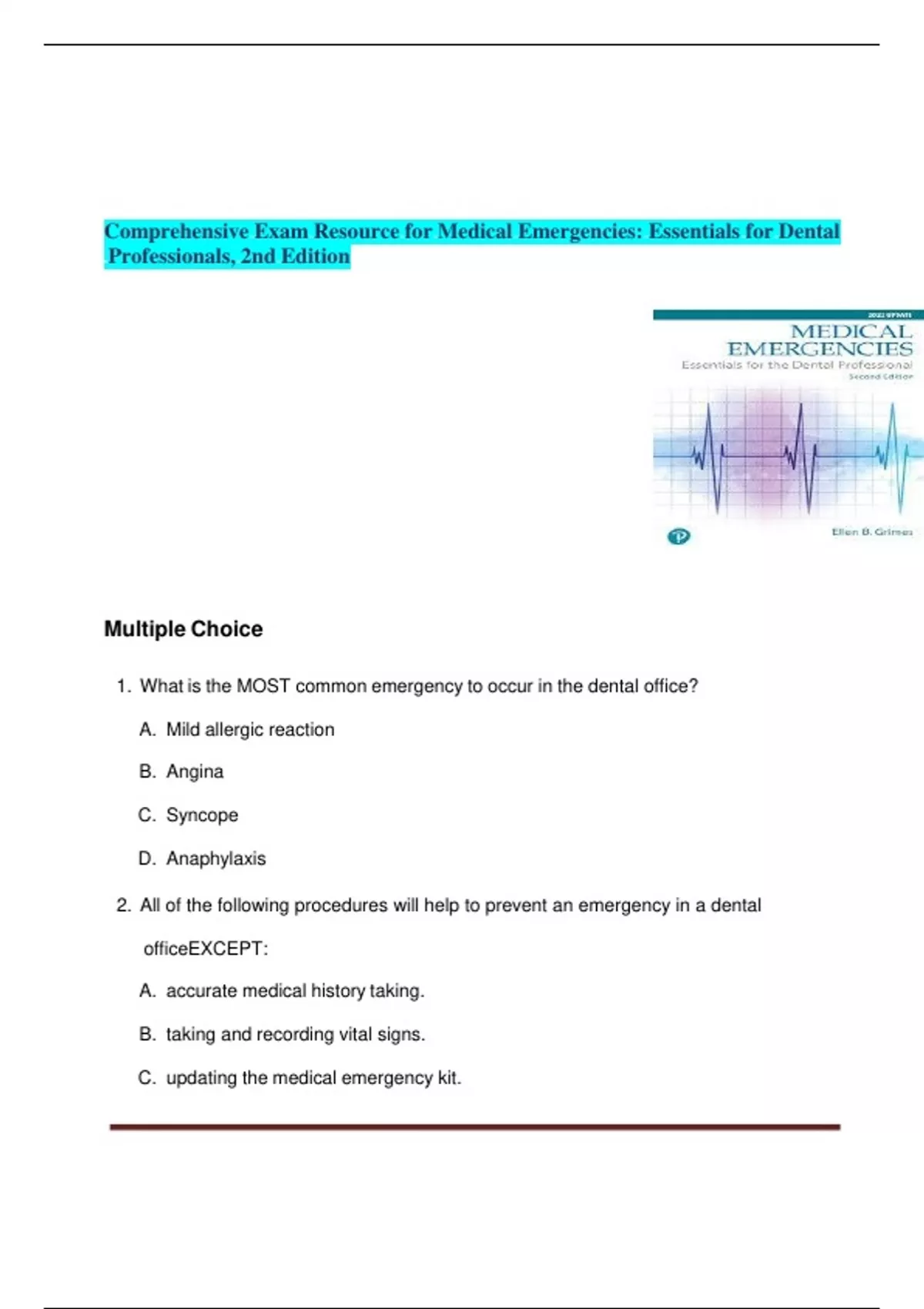 1. What is the MOST common emergency to occur in the dental office?