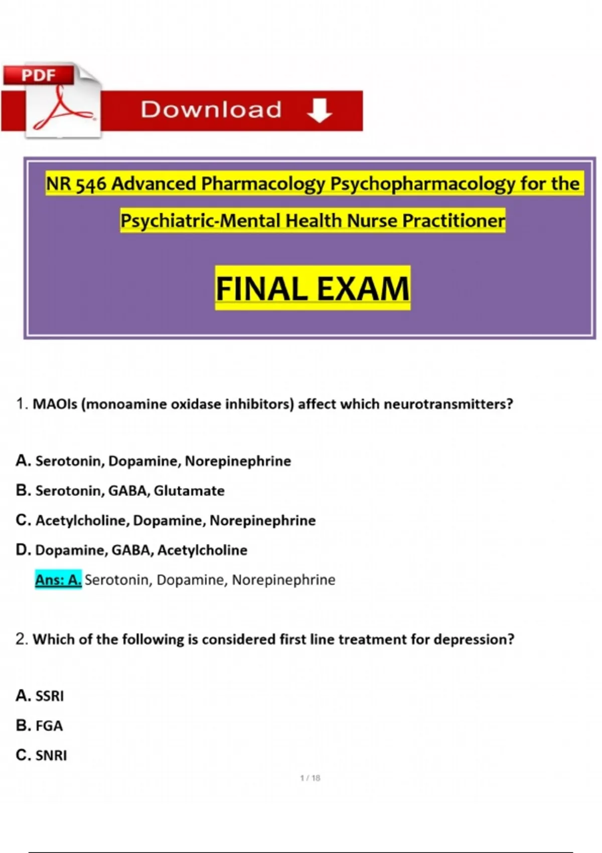 NR546 / NR 546 Final Exam (2024 / 2025): Advanced Pharmacology Psychopharmacology for the Psychiatric-Mental Health Nurse Practitioner, Expected Questions with Verified Answers- Chamberlain
