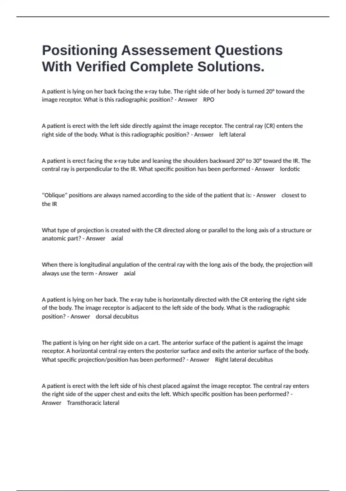 patient is lying on her back facing the x-ray tube. The right side of her body is turned 20° toward the image receptor. What is this radiographic position? - Answer RPO A patient is erect with the left side directly against the image receptor. The central ray (CR) enters the right side of the body. What is this radiographic position? - Answer left lateral A patient is erect facing the x-ray tube and leaning the shoulders backward 20° to 30° toward the IR. The central ray is perpendicular to the IR. What specific position has been performed - Answer lordotic "Oblique" positions are always named according to the side of the patient that is: - Answer closest to the IR What type of projection is created with the CR directed along or parallel to the long axis of a structure or anatomic part? - Answer axial When there is longitudinal angulation of the central ray with the long axis of the body, the projection will always use the term - Answer axial A patient is lying on her back. The x-ray tube is horizontally directed with the CR entering the right side of the body. The image receptor is adjacent to the left side of the body. What is the radiographic position? - Answer dorsal decubitus The patient is lying on her right side on a cart. The anterior surface of the patient is against the image receptor. A horizontal central ray enters the posterior surface and exits the anterior surface of the body. What specific projection/position has been performed? - Answer Right lateral decubitus A patient is erect with the left side of his chest placed against the image receptor. The central ray enters the right side of the upper chest and exits the left. Which specific position has been performed? - Answer Transthoracic lateral