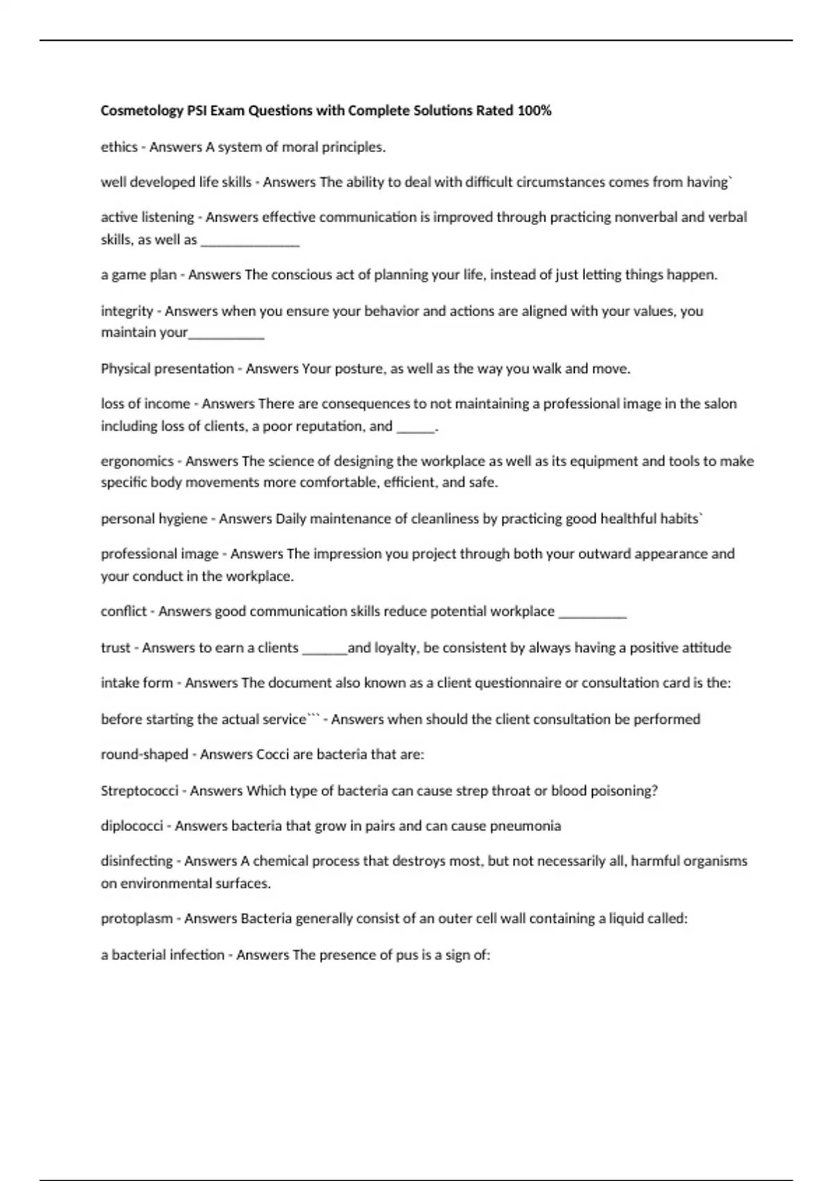 Cosmetology PSI Exam Questions with Complete Solutions Rated 100% ethics - Answers A system of moral principles. well developed life skills - Answers The ability to deal with difficult circumstances comes from having` active listening - Answers effective communication is improved through practicing nonverbal and verbal skills, as well as _____________ a game plan - Answers The conscious act of planning your life, instead of just letting things happen. integrity - Answers when you ensure your behavior and actions are aligned with your values, you maintain your__________ Physical presentation - Answers Your posture, as well as the way you walk and move. loss of income - Answers There are consequences to not maintaining a professional image in the salon including loss of clients, a poor reputation, and _____. ergonomics - Answers The science of designing the workplace as well as its equipment and tools to make specific body movements more comfortable, efficient, and safe. personal hygiene - Answers Daily maintenance of cleanliness by practicing good healthful habits` professional image - Answers The impression you project through both your outward appearance and your conduct in the workplace. conflict - Answers good communication skills reduce potential workplace _________ trust - Answers to earn a clients ______and loyalty, be consistent by always having a positive attitude intake form - Answers The document also known as a client questionnaire or consultation card is the: before starting the actual service``` - Answers when should the client consultation be performed round-shaped - Answers Cocci are bacteria that are: Streptococci - Answers Which type of bacteria can cause strep throat or blood poisoning? diplococci - Answers bacteria that grow in pairs and can cause pneumonia disinfecting - Answers A chemical process that destroys most, but not necessarily all, harmful organisms on environmental surfaces. protoplasm - Answers Bacteria generally consist of an outer cell wall containing a liquid called: a bacterial infection - Answers The presence of pus is a sign of: local - Answers A ______ infection appears as a lesion containing pus and is confined to a particular part of the body. CDC - Answers Which agency publishes the guidelines known as Standard Precautions? Phenolic disinfectants - Answers type of disinfectant with a very high pH that can damage the skin or eyes. Reducing microbes on the skin - Answers Antiseptics are intended for infectious - Answers Standard precautions require employers and employees to assume that all human blood and body fluids are potentially state - Answers licensing, enforcement, and your conduct when you are working in the salon are regulated by Sterilization - Answers The process that completely destroys all microbial life, including spores. skin - Answers never let disinfectants such as phenols come in contact with your _______ porous - Answers Items that are ______ are also considered absorbent. SDSs - Answers Not having ______ available poses a health risk to anyone exposed to hazardous materials and violates federal and state regulations. Standard Precautions - Answers _________ include guidelines for the use of gloves, masks, and eyewear when contact with blood or bodily secretions containing blood or blood elements is a possibility clean, covered - Answers After they have been properly cleaned and disinfected, implements should be stored in a(n) ________ container. contagious disease - Answers a disease that is easily spread from one host to another comunicable disease - Answers a disease that can be passed from person to another person an infectious disease - Answers A disease caused by pathogenic organisms that enter the body, and which may or may not be spread from one person to another person, is ______. acute and chronic effects - Answers As part of the SDS 16 categories, toxicology information includes routes of exposure, related symptoms, and ___________. decontamination - Answers The removal of blood or other potentially infectious materials on an item's surface and the removal of visible debris or residue such as dust, hair, and skin. lice - Answers A parasitic disease may be caused by occupational disease - Answers Illness resulting from conditions associated with employment, such as prolonged and repeated overexposure to certain products or ingredients. Physiology - Answers the study of the functions and activities preformed by the body's structures is called: tibia - Answers the medial and larger bone of the lower leg papillary layer - Answers The layer directly beneath the epidermis is the: collagen and elastin - Answers skin gets its strength, form, and flexibility from thinnest - Answers The epidermis is the _________ layer of the skin.` dermal papillae - Answers fatty tissue found below the dermis is`````` stratum corneum - Answers the outer layer of the epidermis is the _______ layer sebum - Answers A fatty or oily secretion that lubricates the skin and preserves the softness of the hair is nail bed - Answers Portion of the living skin that supports the nail plate as it grows toward the free edge. nail plate - Answers The _____________ is relatively porous and will allow water to pass through. onychomycosis - Answers Fungal infection of the natural nail plate` Trichology - Answers Scientific study of hair and its diseases and care. hair follicle - Answers The tube-like depression or pocket in the skin or scalp that contains the hair root. anagen - Answers growth phase in the hair cycle in which a new hair shaft is created catagen - Answers the brief transition period between the growth and resting phases of a hair follicle is stronger than fine hair - Answers coarse hair hair cuticle - Answers outermost layer of hair cortex - Answers Middle layer of the hair; a fibrous protein core formed by elongated cells containing melanin pigment. acidic - Answers A substance that has a pH below 7.0 is considered to be: