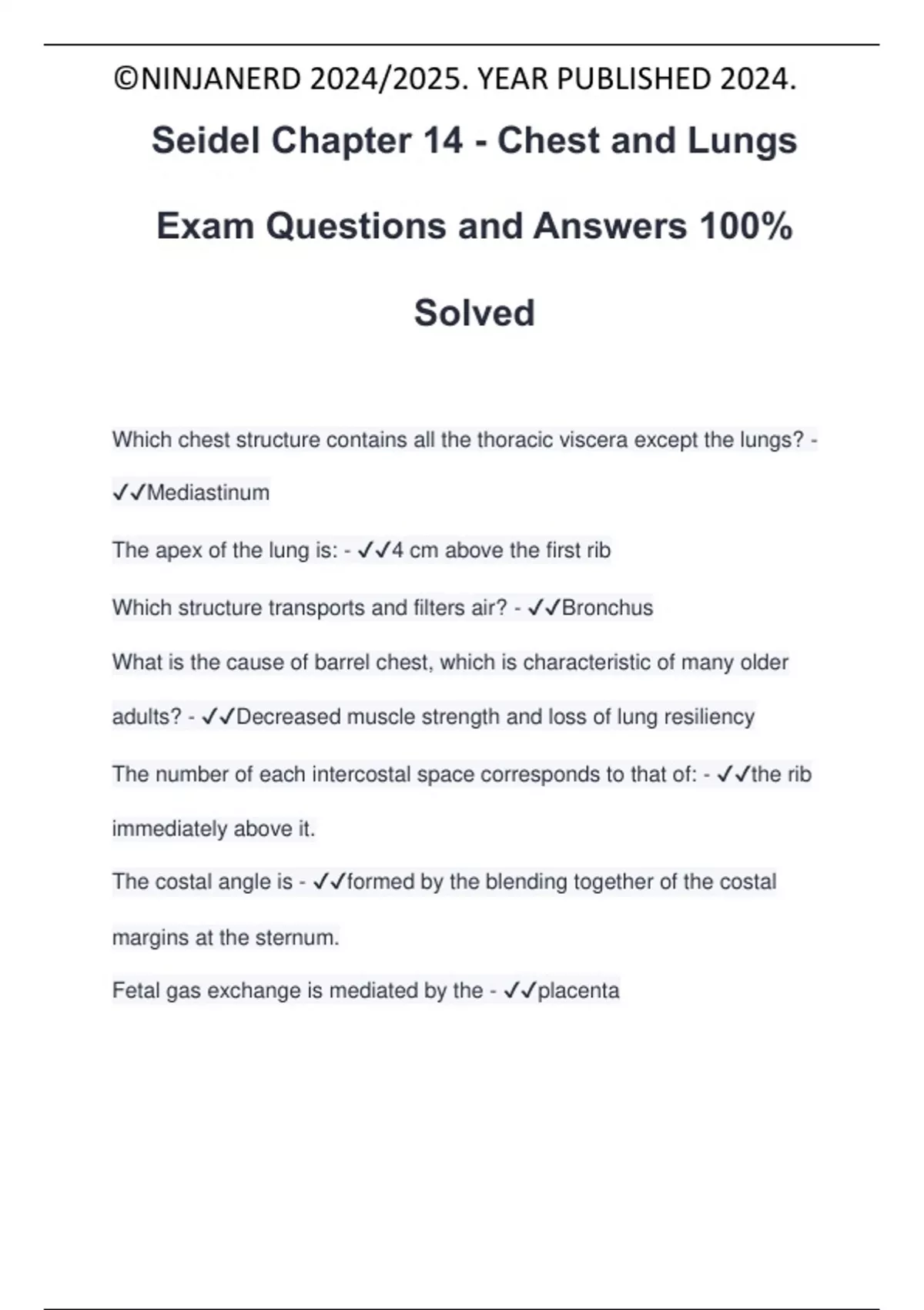Seidel Chapter 14 - Chest and Lungs Exam Questions and Answers 100% Solved Which chest structure contains all the thoracic viscera except the lungs? - Mediastinum The apex of the lung is: - 4 cm above the first rib Which structure transports and filters air? - Bronchus What is the cause of barrel chest, which is characteristic of many older adults? - Decreased muscle strength and loss of lung resiliency The number of each intercostal space corresponds to that of: - the rib immediately above it. The costal angle is - formed by the blending together of the costal margins at the sternum. Fetal gas exchange is mediated by the - placenta