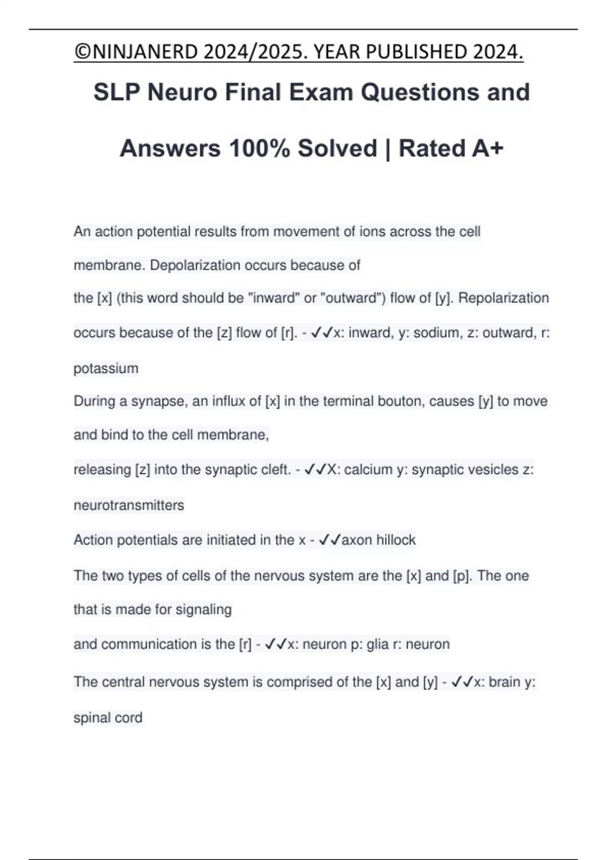 SLP Neuro Final Exam Questions and Answers 100% Solved | Rated A+ An action potential results from movement of ions across the cell membrane. Depolarization occurs because of the [x] (this word should be "inward" or "outward") flow of [y]. Repolarization occurs because of the [z] flow of [r]. - x: inward, y: sodium, z: outward, r: potassium During a synapse, an influx of [x] in the terminal bouton, causes [y] to move and bind to the cell membrane, releasing [z] into the synaptic cleft. - X: calcium y: synaptic vesicles z: neurotransmitters Action potentials are initiated in the x - axon hillock The two types of cells of the nervous system are the [x] and [p]. The one that is made for signaling and communication is the [r] - x: neuron p: glia r: neuron The central nervous system is comprised of the [x] and [y] - x: brain y: spinal cord