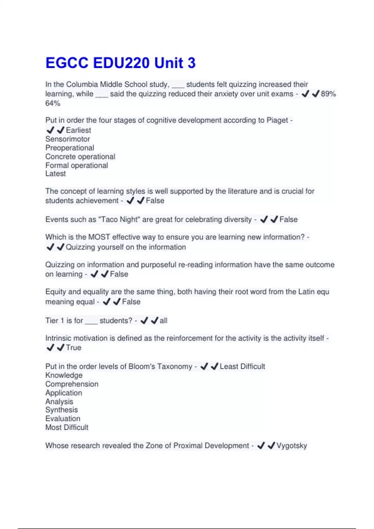 In the Columbia Middle School study, ___ students felt quizzing increased their learning, while ___ said the quizzing reduced their anxiety over unit exams - ️️89% 64% Put in order the four stages of cognitive development according to Piaget - ️️Earliest Sensorimotor Preoperational Concrete operational Formal operational Latest The concept of learning styles is well supported by the literature and is crucial for students achievement - ️️False Events such as "Taco Night" are great for celebrating diversity - ️️False Which is the MOST effective way to ensure you are learning new information? - ️️Quizzing yourself on the information Quizzing on information and purposeful re-reading information have the same outcome on learning - ️️False Equity and equality are the same thing, both having their root word from the Latin equ meaning equal - ️️False Tier 1 is for ___ students? - ️️all Intrinsic motivation is defined as the reinforcement for the activity is the activity itself - ️️True Put in the order levels of Bloom's Taxonomy - ️️Least Difficult Knowledge Comprehension Application Analysis Synthesis Evaluation Most Difficult Whose research revealed the Zone of Proximal Development - ️️Vygotsky