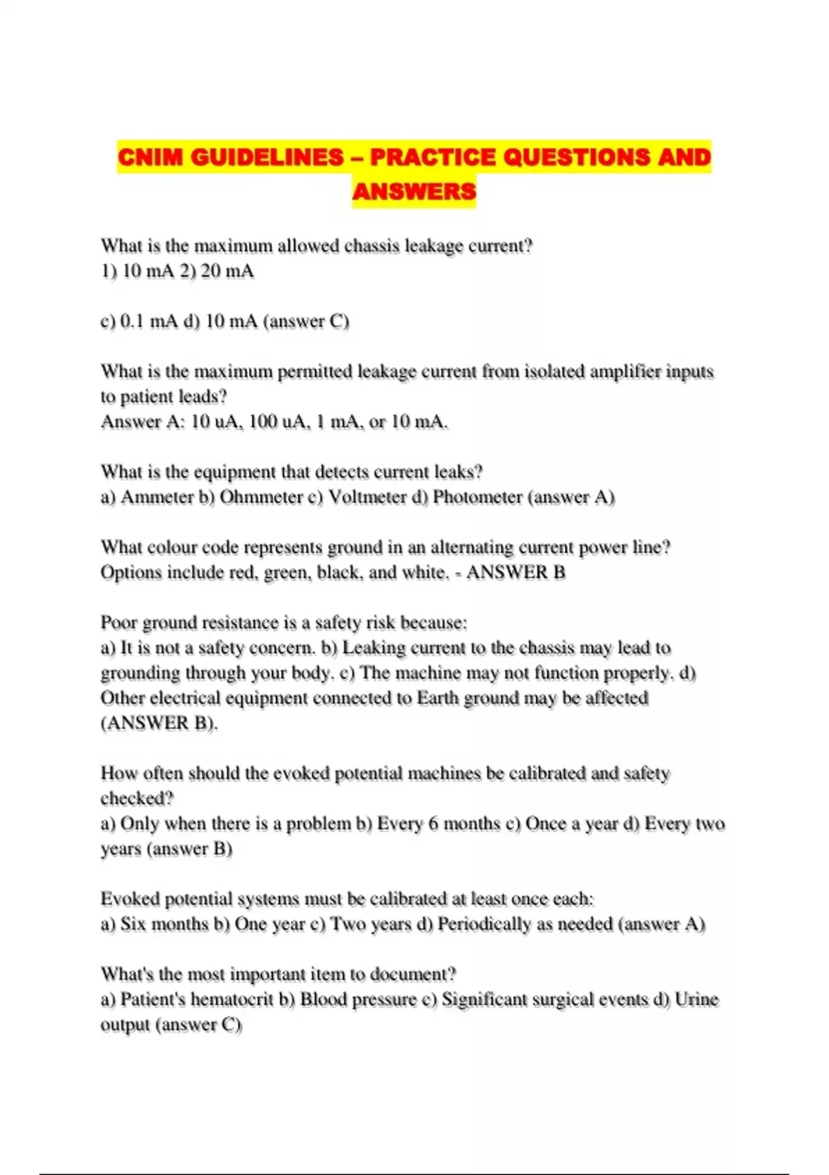 CNIM GUIDELINES – PRACTICE QUESTIONS AND