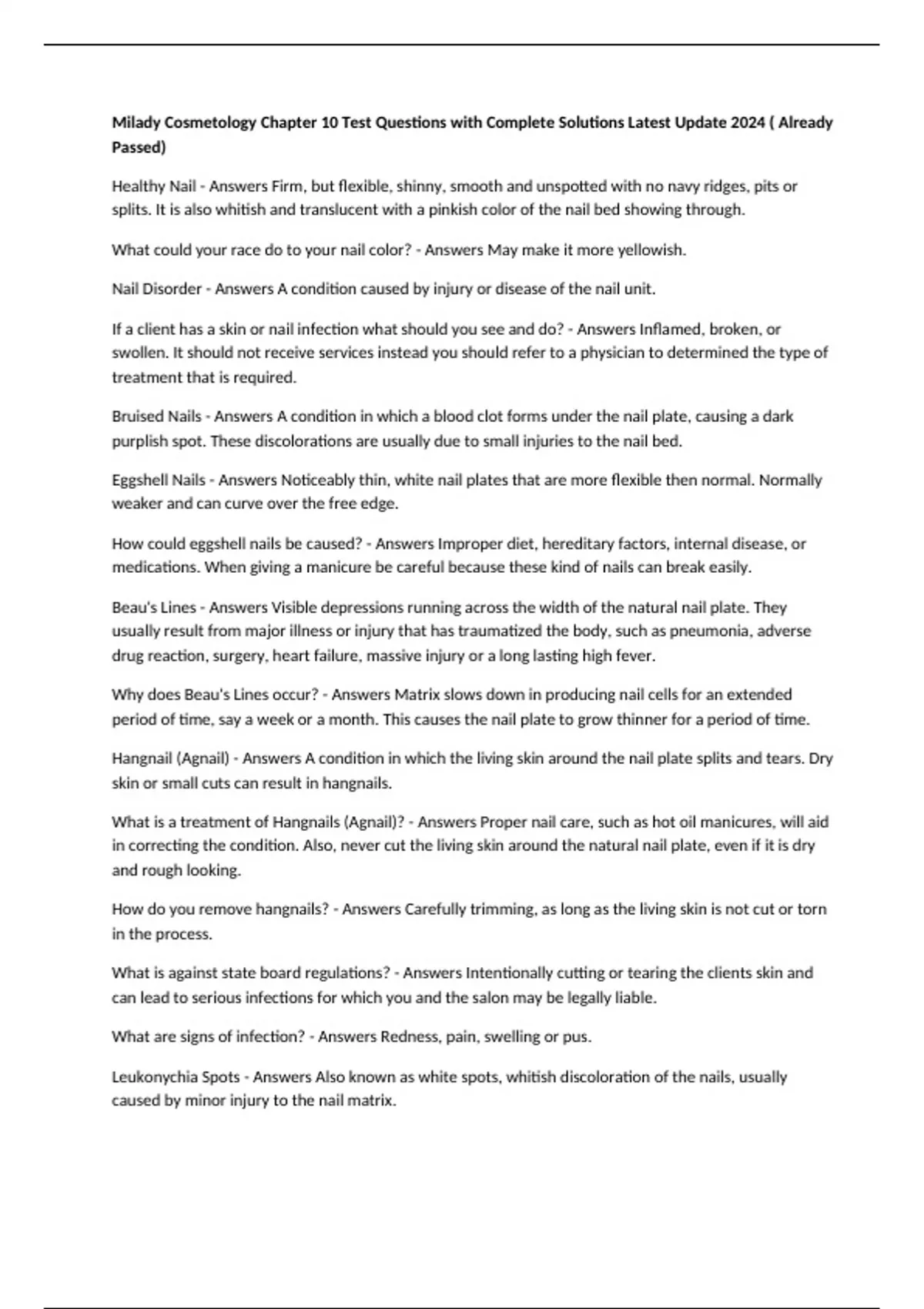 Milady Cosmetology Chapter 10 Test Questions with Complete Solutions Latest Update 2024 ( Already Passed) Healthy Nail - Answers Firm, but flexible, shinny, smooth and unspotted with no navy ridges, pits or splits. It is also whitish and translucent with a pinkish color of the nail bed showing through. What could your race do to your nail color? - Answers May make it more yellowish. Nail Disorder - Answers A condition caused by injury or disease of the nail unit. If a client has a skin or nail infection what should you see and do? - Answers Inflamed, broken, or swollen. It should not receive services instead you should refer to a physician to determined the type of treatment that is required. Bruised Nails - Answers A condition in which a blood clot forms under the nail plate, causing a dark purplish spot. These discolorations are usually due to small injuries to the nail bed. Eggshell Nails - Answers Noticeably thin, white nail plates that are more flexible then normal. Normally weaker and can curve over the free edge. How could eggshell nails be caused? - Answers Improper diet, hereditary factors, internal disease, or medications. When giving a manicure be careful because these kind of nails can break easily. Beau's Lines - Answers Visible depressions running across the width of the natural nail plate. They usually result from major illness or injury that has traumatized the body, such as pneumonia, adverse drug reaction, surgery, heart failure, massive injury or a long lasting high fever. Why does Beau's Lines occur? - Answers Matrix slows down in producing nail cells for an extended period of time, say a week or a month. This causes the nail plate to grow thinner for a period of time. Hangnail (Agnail) - Answers A condition in which the living skin around the nail plate splits and tears. Dry skin or small cuts can result in hangnails. What is a treatment of Hangnails (Agnail)? - Answers Proper nail care, such as hot oil manicures, will aid in correcting the condition. Also, never cut the living skin around the natural nail plate, even if it is dry and rough looking. How do you remove hangnails? - Answers Carefully trimming, as long as the living skin is not cut or torn in the process. What is against state board regulations? - Answers Intentionally cutting or tearing the clients skin and can lead to serious infections for which you and the salon may be legally liable. What are signs of infection? - Answers Redness, pain, swelling or pus. Leukonychia Spots - Answers Also known as white spots, whitish discoloration of the nails, usually caused by minor injury to the nail matrix. Melanonychia - Answers Darkening of the fingernails or toenails. It may be seen as a black band within the nail plate, extending from the base to the free edge. Discolored nails - Answers Nails that turn a variety of colors, which may indicate surface staining, a systemic disorder, or poor blood circulation. Could be caused by nail polish, smoking and food dyes. What is internal discoloration due too? - Answers Biological, medical or even pharmaceutical reasons. Onychophagy - Answers Also known as bitten nails, is the result of a habit of chewing the nail or the hardened, damaged skin surrounding the nail plate. Onychorrhexis - Answers Also known as split nails or brittle nails, that have a series of lengthwise ridges giving a rough appearance to the surface of the nail plate. This is caused by injury to the matrix, excessive use of cuticle removers, harsh cleaning agents, aggressive filing techniques, or heredity. When should nail enhancements never be applied? - Answers If the nail bed is exposed. What does onychorrhexis lack of? And how can you treat it? - Answers Lack sufficient moisture, so twice-daily treatments with a high quality, penetrating nail oil can be very beneficial. Plicatured Nail - Answers Also known as folded nail, is a type of highly curved nail plate usually caused by injury to the matrix, but it may be inherited. This condition often leads to ingrown nails. Nail Pterygium - Answers An abnormal condition that occurs when the skin is stretched by the nail plate. Caused by serious injury such as burns, or an adverse skin reaction to chemical nail enhancement products. What is wrong with the words cuticle and pterygium? - Answers Do not designate the same thing, and they should never be used interchangeably. How is Nail Pterygium caused? - Answers Abnormal and damage to the eponuchium or hyponychium. What shouldn't you do to a Nail Pterygium? - Answers Do not treat the nail, or push back the extension of skin back with an instrument. Doing this will cause more damage to the tissues and will make the condition worse. What treatment should you do for a Nail Pterygium? - Answers The gentle massage of conditioning oils or creams into the affected area may be beneficial.