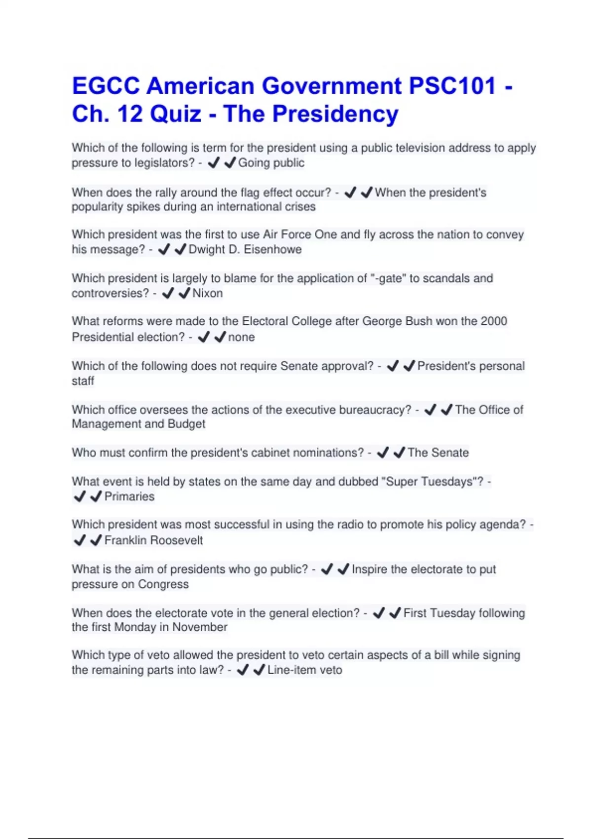 EGCC American Government PSC101 - Ch. 12 Quiz - The Presidency Latest Questions and Answers 100% Correct.