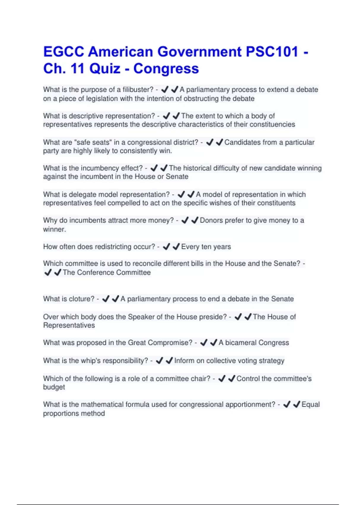 EGCC American Government PSC101 - Ch. 11 Quiz - Congress (Questions and answers) LATEST UPDATE