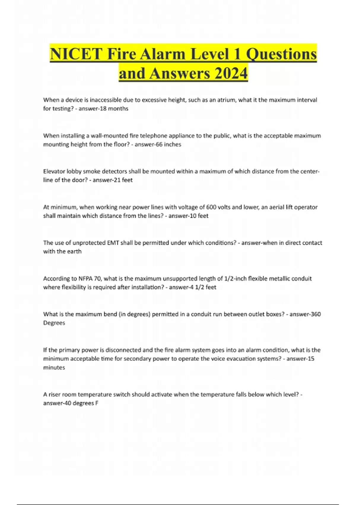 NICET Fire Alarm Level 1 Questions and Answers 2024 When a device is inaccessible due to excessive height, such as an atrium, what it the maximum interval for testing? - answer-18 months When installing a wall-mounted fire telephone appliance to the public, what is the acceptable maximum mounting height from the floor? - answer-66 inches Elevator lobby smoke detectors shall be mounted within a maximum of which distance from the centerline of the door? - answer-21 feet At minimum, when working near power lines with voltage of 600 volts and lower, an aerial lift operator shall maintain which distance from the lines? - answer-10 feet The use of unprotected EMT shall be permitted under which conditions? - answer-when in direct contact with the earth According to NFPA 70, what is the maximum unsupported length of 1/2-inch flexible metallic conduit where flexibility is required after installation? - answer-4 1/2 feet What is the maximum bend (in degrees) permitted in a conduit run between outlet boxes? - answer-360 Degrees If the primary power is disconnected and the fire alarm system goes into an alarm condition, what is the minimum acceptable time for secondary power to operate the voice evacuation systems? - answer-15 minutes