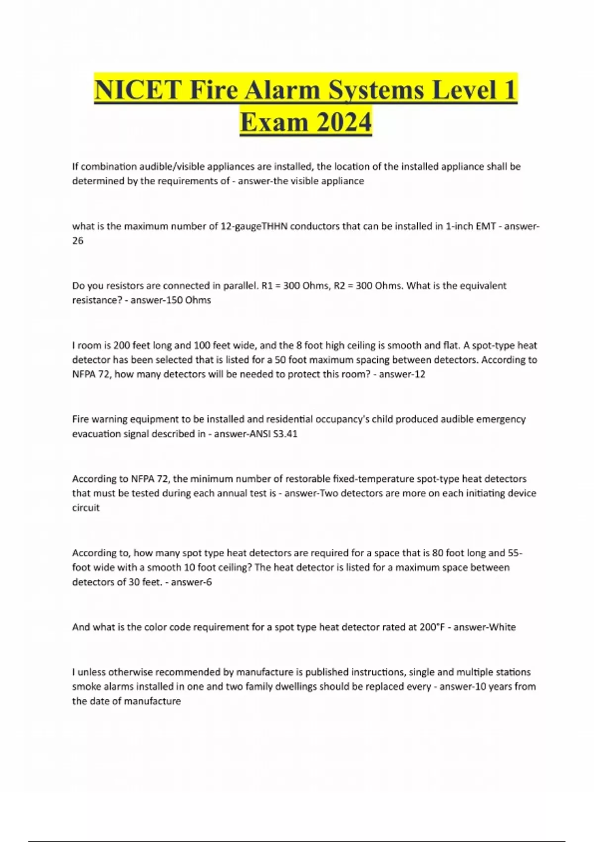 NICET Fire Alarm Systems Level 1 Exam 2024 If combination audible/visible appliances are installed, the location of the installed appliance shall be determined by the requirements of - answer-the visible appliance what is the maximum number of 12-gaugeTHHN conductors that can be installed in 1-inch EMT - answer- 26 Do you resistors are connected in parallel. R1 = 300 Ohms, R2 = 300 Ohms. What is the equivalent resistance? - answer-150 Ohms I room is 200 feet long and 100 feet wide, and the 8 foot high ceiling is smooth and flat. A spot-type heat detector has been selected that is listed for a 50 foot maximum spacing between detectors. According to NFPA 72, how many detectors will be needed to protect this room? - answer-12 Fire warning equipment to be installed and residential occupancy's child produced audible emergency evacuation signal described in - answer-ANSI S3.41 According to NFPA 72, the minimum number of restorable fixed-temperature spot-type heat detectors that must be tested during each annual test is - answer-Two detectors are more on each initiating device circuit According to, how many spot type heat detectors are required for a space that is 80 foot long and 55- foot wide with a smooth 10 foot ceiling? The heat detector is listed for a maximum space between detectors of 30 feet. - answer-6 And what is the color code requirement for a spot type heat detector rated at 200°F - answer-White