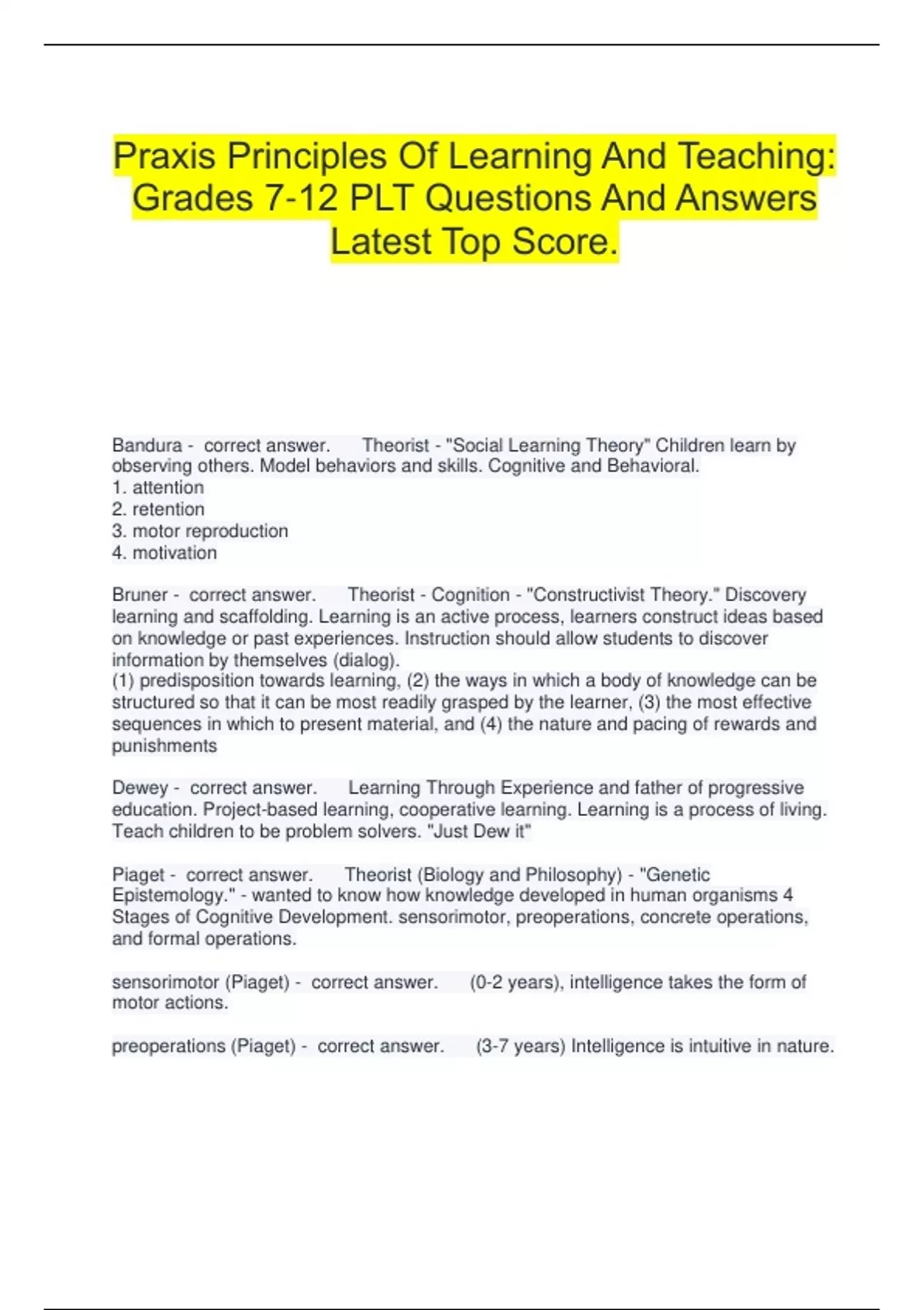 Praxis Principles Of Learning And Teaching: Grades 7-12 PLT Questions And Answers Latest Top Score.