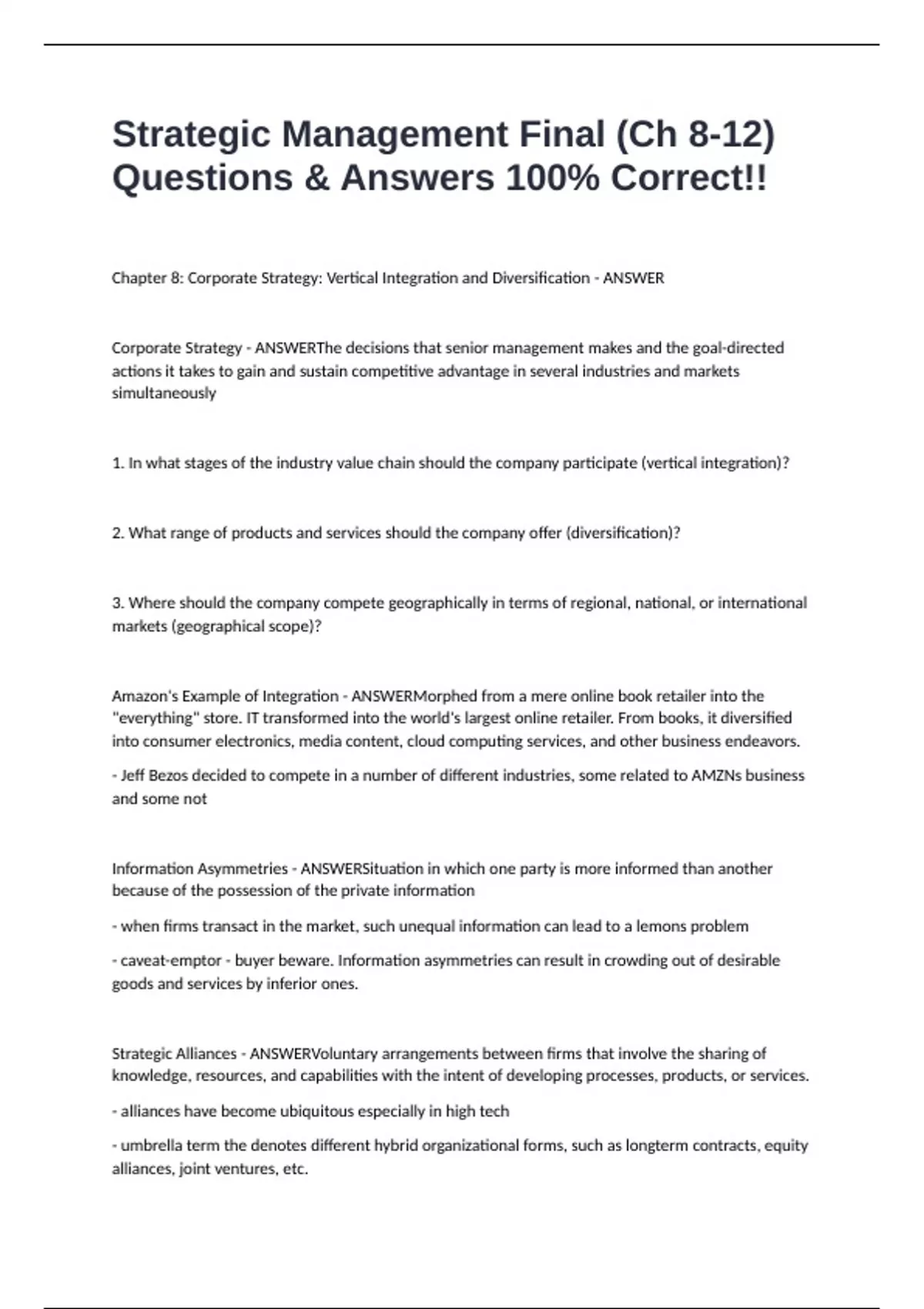 Chapter 8: Corporate Strategy: Vertical Integration and Diversification - ANSWER Corporate Strategy - ANSWERThe decisions that senior management makes and the goal-directed actions it takes to gain and sustain competitive advantage in several industries and markets simultaneously 1. In what stages of the industry value chain should the company participate (vertical integration)? 2. What range of products and services should the company offer (diversification)? 3. Where should the company compete geographically in terms of regional, national, or international markets (geographical scope)? Amazon's Example of Integration - ANSWERMorphed from a mere online book retailer into the "everything" store. IT transformed into the world's largest online retailer. From books, it diversified into consumer electronics, media content, cloud computing services, and other business endeavors. - Jeff Bezos decided to compete in a number of different industries, some related to AMZNs business and some not Information Asymmetries - ANSWERSituation in which one party is more informed than another because of the possession of the private information - when firms transact in the market, such unequal information can lead to a lemons problem - caveat-emptor - buyer beware. Information asymmetries can result in crowding out of desirable goods and services by inferior ones. Strategic Alliances - ANSWERVoluntary arrangements between firms that involve the sharing of knowledge, resources, and capabilities with the intent of developing processes, products, or services. - alliances have become ubiquitous especially in high tech - umbrella term the denotes different hybrid organizational forms, such as longterm contracts, equity alliances, joint ventures, etc. Why Do Firms Need To Grow? - ANSWER1. Increase Profits
