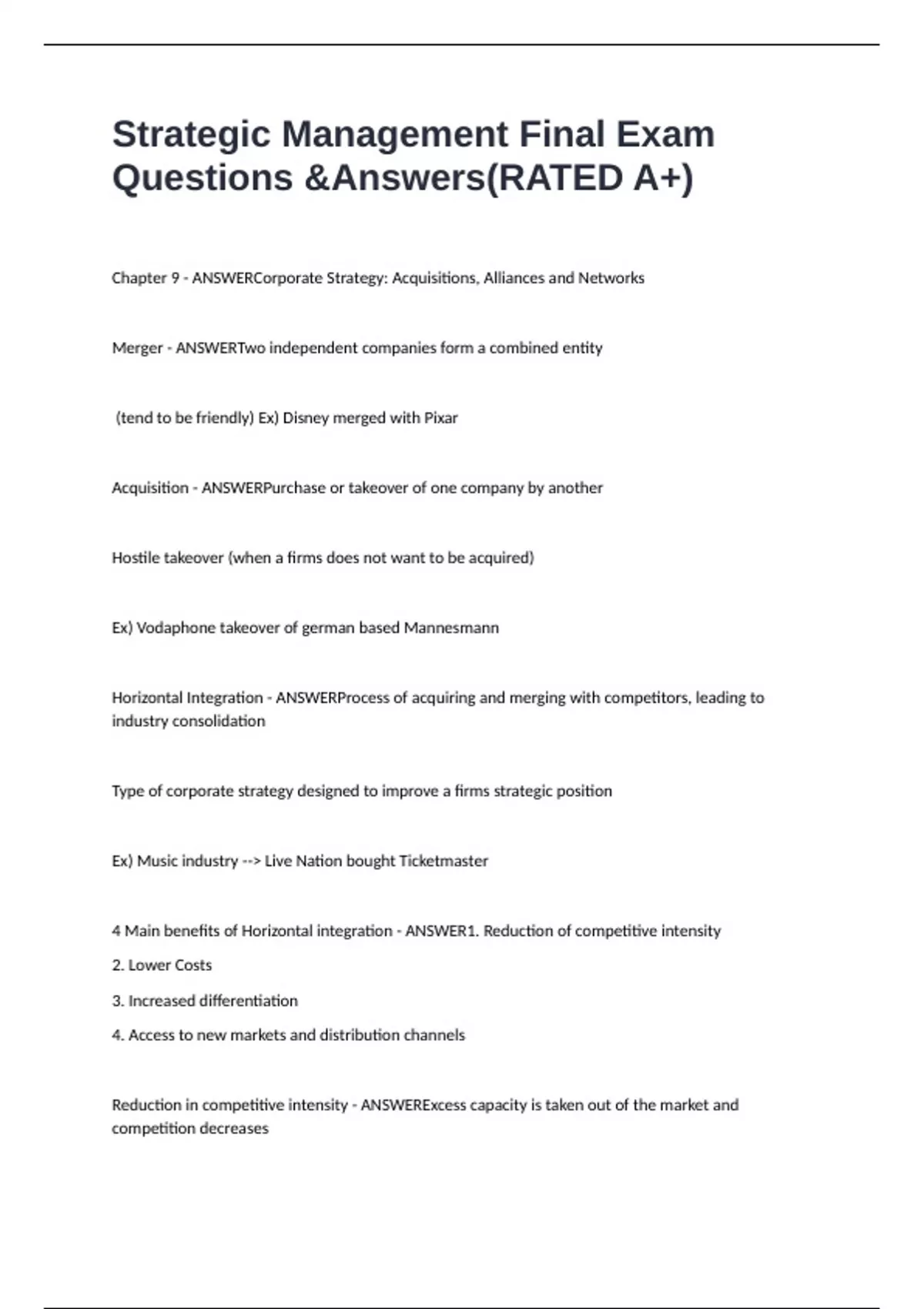 Chapter 9 - ANSWERCorporate Strategy: Acquisitions, Alliances and Networks Merger - ANSWERTwo independent companies form a combined entity (tend to be friendly) Ex) Disney merged with Pixar Acquisition - ANSWERPurchase or takeover of one company by another Hostile takeover (when a firms does not want to be acquired) Ex) Vodaphone takeover of german based Mannesmann Horizontal Integration - ANSWERProcess of acquiring and merging with competitors, leading to industry consolidation Type of corporate strategy designed to improve a firms strategic position Ex) Music industry --> Live Nation bought Ticketmaster 4 Main benefits of Horizontal integration - ANSWER1. Reduction of competitive intensity 2. Lower Costs 3. Increased differentiation 4. Access to new markets and distribution channels Reduction in competitive intensity - ANSWERExcess capacity is taken out of the market and competition decreases oligopolistic industry structure, focus is on non-price competition --> greater chance for profitability