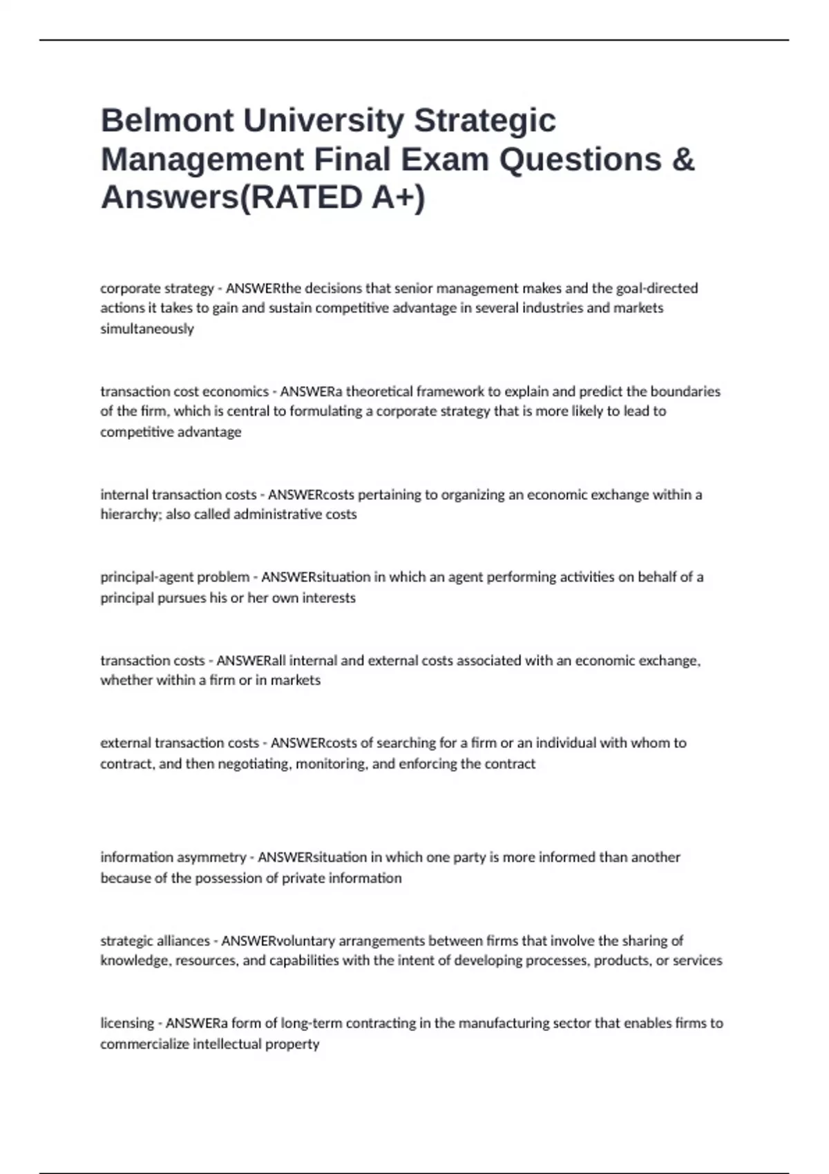 Belmont University Strategic Management Final Exam Questions & Answers(RATED A+)