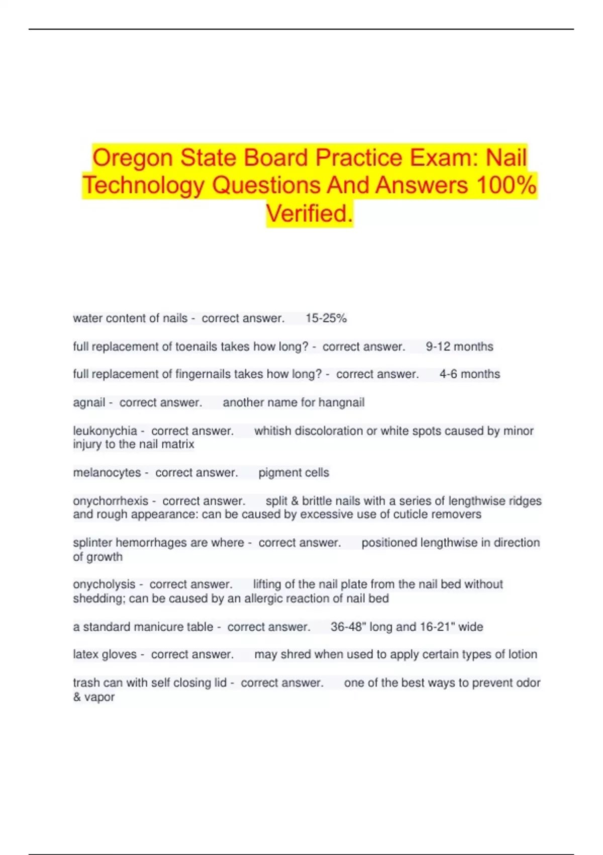 Oregon State Board Practice Exam: Nail Technology Questions And Answers 100% Verified. water content of nails - correct answer. 15-25% full replacement of toenails takes how long? - correct answer. 9-12 months full replacement of fingernails takes how long? - correct answer. 4-6 months agnail - correct answer. another name for hangnail leukonychia - correct answer. whitish discoloration or white spots caused by minor injury to the nail matrix melanocytes - correct answer. pigment cells onychorrhexis - correct answer. split & brittle nails with a series of lengthwise ridges and rough appearance: can be caused by excessive use of cuticle removers splinter hemorrhages are where - correct answer. positioned lengthwise in direction of growth onycholysis - correct answer. lifting of the nail plate from the nail bed without shedding; can be caused by an allergic reaction of nail bed a standard manicure table - correct answer. 36-48" long and 16-21" wide latex gloves - correct answer. may shred when used to apply certain types of lotion trash can with self closing lid - correct answer. one of the best ways to prevent odor & vapor metal pusher - correct answer. should not be used to push the eponychium; only used to scrape cuticle from nail plate nail polish brushes - correct answer. are exempt from the single-use rule reusing implements without properly cleaning & disinfecting - correct answer. illegal in all states appearance of nails - correct answer. can reflect the general health of the body keratin in nails - correct answer. harder than keratin in skin or hair nail beds need - correct answer. oxygen, vitamins, & minerals toenail matrix - correct answer. longer than fingernail matrix plicatured nails - correct answer. also called a "folded nail" and indicated by a highly curved nail plate; can often lead to ingrown nails clients with a fungal infection - correct answer. can transmit the infection to another client if proper safety & sanitation is not followed discoloration of nail plate - correct answer. result of bacterial infection, not mold nail psoriasis - correct answer. tiny pitting or severe roughness on surface of nail plate; not an infectious disease currently the fastest growing nail service - correct answer. manicures & pedicures spatula - correct answer. used to prevent contamination when removing products from containers oil & lotion - correct answer. can penetrate the nail plate or skin & increase flexibility of natural nail skin damage caused by the sun - correct answer. 90% polishing - correct answer. the last step in a manicure who goes longer between services & may need more work done on their skin & nails? - correct answer. men paraffin wax heaters typically are at what temperature? - correct answer. 125-130 F what was the fastest growing nail service in the 1990s - correct answer. pedicures nippers - correct answer. used to trim tags of dead skin blades - correct answer. can cause infection: do not use to remove calluses podiatrist - correct answer. specialized doctor of the feet. send clients here if they have fungus dominant foot - correct answer. usually needs more soaking & attention strong massage - correct answer. avoid for clients with sensitive skin or who are prone to redness wrap material - correct answer. gives the system its unique properties hold the nail tip ______ until the adhesive has dried - correct answer. 5-10 seconds glass bowl filled with acetone - correct answer. one method of removing nail enhancements liquid & powder enhancements - correct answer. lucrative services catalyst - correct answer. added to monomer liquid to control curing time acid based nail primer - correct answer. corrosive to skin & potentially dangerous to eyes hand sanitizer - correct answer. cannot take the place of proper hand washing primer and liquid storage - correct answer. must be stored separately in a cool dark area UV gel ingredients - correct answer. from the same family as monomer liquid & polymer powder oligomers - correct answer. between a solid and liquid viscosity - correct answer. measures the thickness or thinness of a liquid wattage - correct answer. measures how much electricity a UV lamp consumes integumentary system - correct answer. includes the nails nail flexibility - correct answer. directly affected by water content nail plate - correct answer. most visible and functional part of the nail