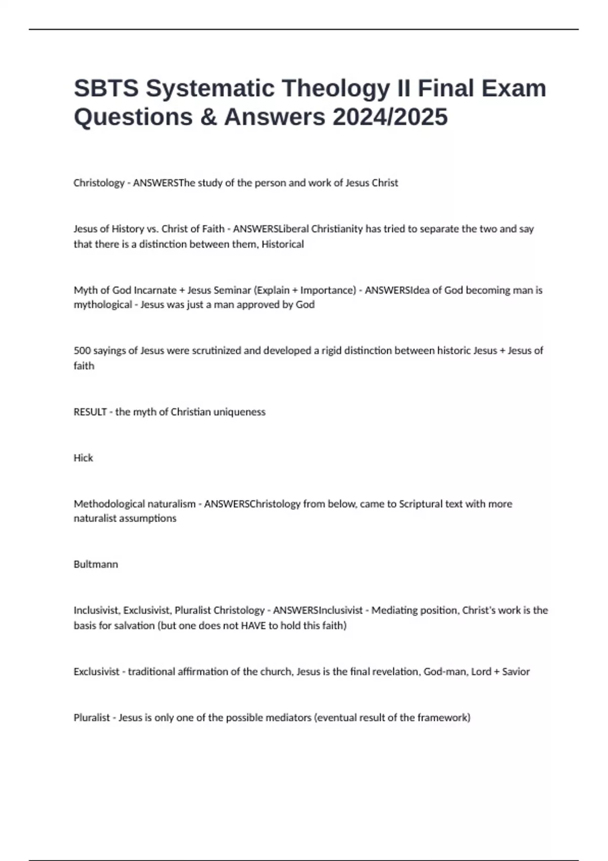 Christology - ANSWERSThe study of the person and work of Jesus Christ