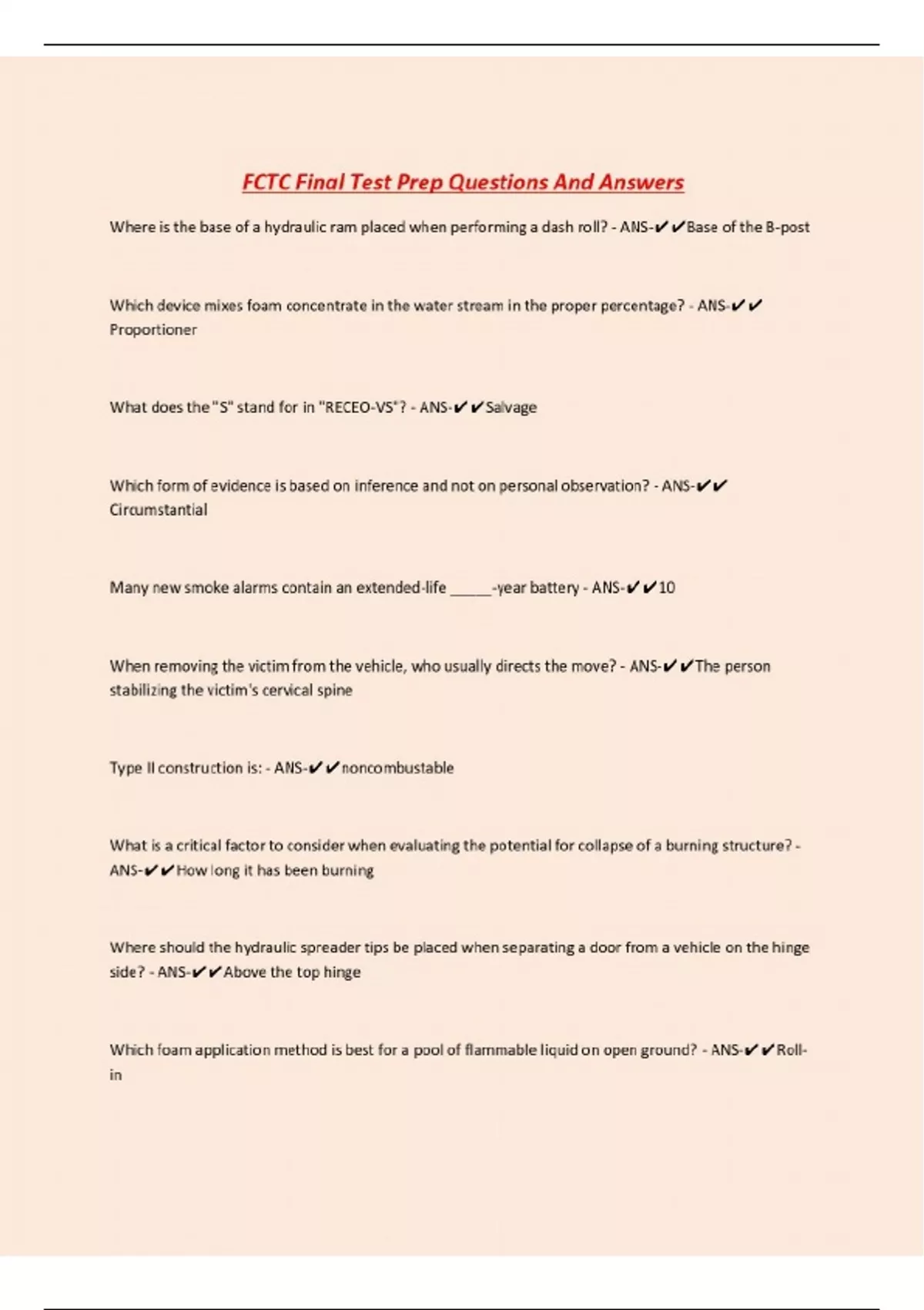 FCTC Final Test Prep Questions And Answers Where is the base of a hydraulic ram placed when performing a dash roll? - ANS-Base of the B-post Which device mixes foam concentrate in the water stream in the proper percentage? - ANS- Proportioner What does the "S" stand for in "RECEO-VS"? - ANS-Salvage Which form of evidence is based on inference and not on personal observation? - ANS- Circumstantial Many new smoke alarms contain an extended-life _____-year battery - ANS-10 When removing the victim from the vehicle, who usually directs the move? - ANS-The person stabilizing the victim's cervical spine Type II construction is: - ANS-noncombustable What is a critical factor to consider when evaluating the potential for collapse of a burning structure? - ANS-How long it has been burning Where should the hydraulic spreader tips be placed when separating a door from a vehicle on the hinge side? - ANS-Above the top hinge Which foam application method is best for a pool of flammable liquid on open ground? - ANS...