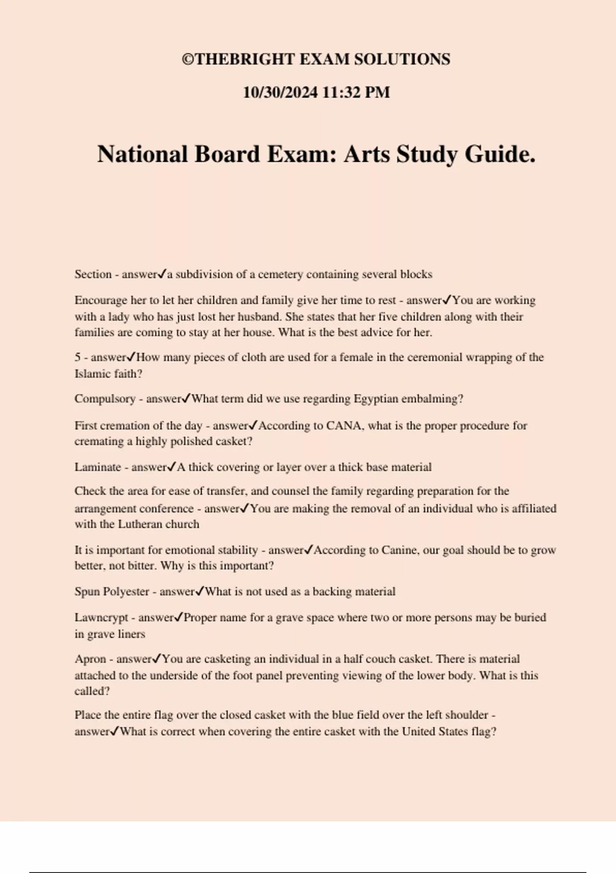 National Board Exam: Arts Study Guide. Section - answera subdivision of a cemetery containing several blocks Encourage her to let her children and family give her time to rest - answerYou are working with a lady who has just lost her husband. She states that her five children along with their families are coming to stay at her house. What is the best advice for her. 5 - answerHow many pieces of cloth are used for a female in the ceremonial wrapping of the Islamic faith? Compulsory - answerWhat term did we use regarding Egyptian embalming? First cremation of the day - answerAccording to CANA, what is the proper procedure for cremating a highly polished casket? Laminate - answerA thick covering or layer over a thick base material Check the area for ease of transfer, and counsel the family regarding preparation for the arrangement conference - answerYou are making the removal of an individual who is affiliated with the Lutheran church It is important for emotional stability - answerAccording to Canine, our goal should be to grow better, not bitter. Why is this important? Spun Polyester - answerWhat is not used as a backing material Lawncrypt - answerProper name for a grave space where two or more persons may be buried in grave liners Apron - answerYou are casketing an individual in a half couch casket. There is material attached to the underside of the foot panel preventing viewing of the lower body. What is this called? Place the entire flag over the closed casket with the blue field over the left shoulder - answerWhat is correct when covering the entire casket with the United States flag? ©THEBRIGHT EXAM SOLUTIONS 10/30/2024 11:32 PM 0-3 years of age - answerAccording to some researchers, children have no comprehension of death between what age Right of custody - answera limited right, given for a specific purpose, and subject to revocation if the party possessing it does not utilize it for a proper purpose The american legion - answerOrganization that is open to men and women and has a National Commander elected annually Involuntary active euthanasia - answerIntervention intended to kill a person who is incapable of making a request to die McGregor's theory X - answerTheory states that people must be threatened in order to perform Acculturation - answerThe process with which members of one culture assimilate the traits of another Gasketed - answerClosure method that utilizes a flat rubber material along the top body molding flange Funeral service is more open to women and those looking for a second career - answerStatement regarding those choosing to enter the field of funeral service DD-214 - answerA form required regarding VA benefits 21 - answerIf possible the American Legion will provide a full military detail for the committal service. How many individuals are involved in a full military funeral detail? 1. Surviving spouse 2. Adult son or daughter 3. Either parent 4. Brother or sister 5. Guardian 6. Authorized person - answerOrder regarding rights of disposition Physical - answerYou are paying an acceptable wage and allowing your employees to maintain a sufficient living. Which of Maslow's "needs" are you fulfilling? Rapport - answerA relation of harmony, conformity, accord, or affinity established in any human interaction ©THEBRIGHT EXAM SOLUTIONS 10/30/2024 11:32 PM Prior to the regular service - answerYou are working with a member of the Jewish community who is also a member of the B'nai B'rith. When will the fraternity wish to practice their funeral rite? Quasi-property - answerAllows the body to be treated as property for the purpose of disposition only Cadaver - answerA dead human body intended solely for scientific study and dissection Mr. Franklin is well within his rights to include or exclude whomever he wishes - answerMr. Franklin's wife has passed away. Mrs. Franklin has three children and six grandchildren from a previous marriage. Mr. Franklin chooses a private ceremony, without and public obituary, or public notice. Hold out the expectations that the griever will successfully complete the mourning process - answerAccording to intervention strategies for grief counselor, we should Cenotaph - answerMonument erected to the memory of the dead, without the body present Medical devices should be removed by a licensed embalmer, even if embalming is not required. - answerConsidered the "best practice" when dealing with medical devices and cremation. Acolyte - answerAltar attendant, usually in a liturgical church Use a bassinet - answerConsidered the "best practice" when transferring an infant from the place of the funeral home or place of embalming Body parts - answerIn the Uniformed Anatomical Gift Act, these are defined as organs, tissues, eyes, bones, arteries, blood, other fluids, and other portions of a human body transplantation Diocese - answerMonsignor Mike is the head of several parishes. What is his geographical region called? $885.00 - answerYou are working with a firm which utilizes the fixed multiple method for casket sales. The fixed multiple is 3x the wholesale cost of the casket. How much would your firm sell a casket which costs $295.00 wholesale? Adult formula sale - answerComplete adult services utilizing all the services and merchandise a funeral director has to offer Administrative law - answerRules, regulations, orders, and decisions created by the Federal and state administrative agencies (OSHA, FTC, State board rules)