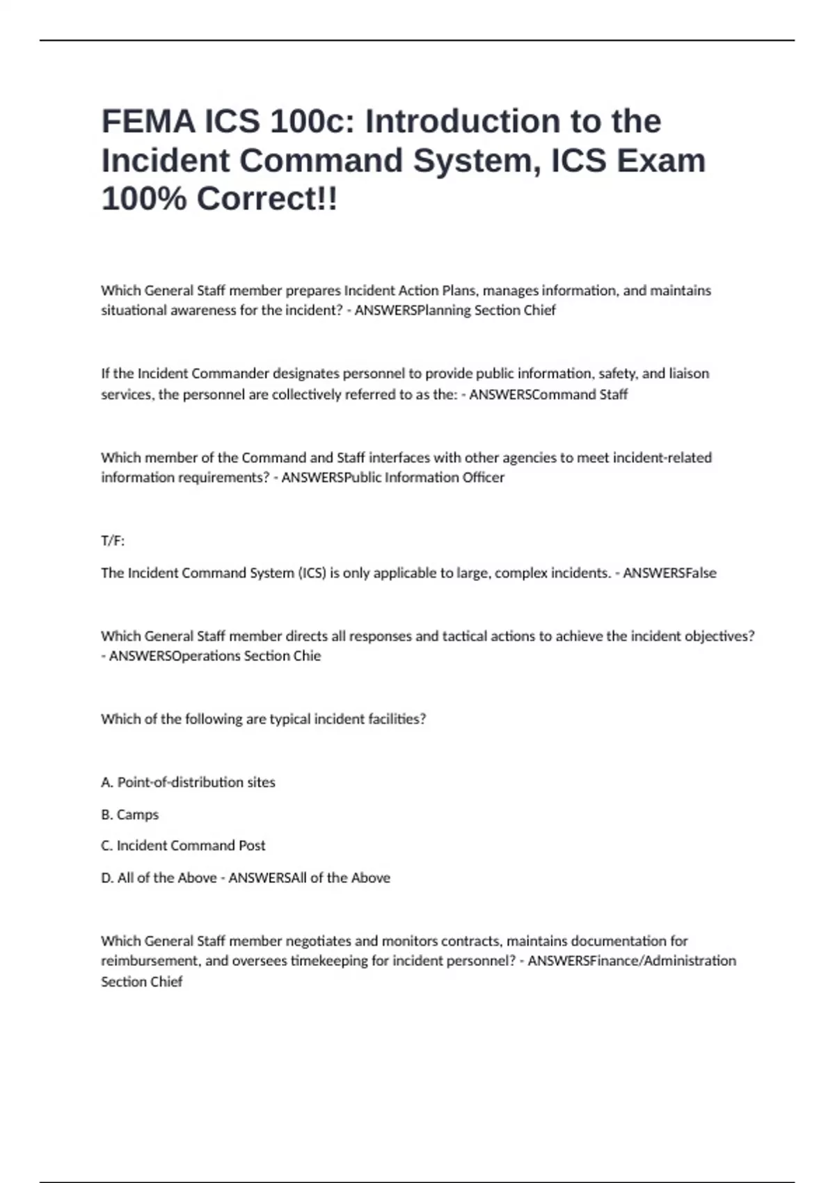 FEMA ICS 100c: Introduction to the Incident Command System, ICS Exam 100% Correct!!