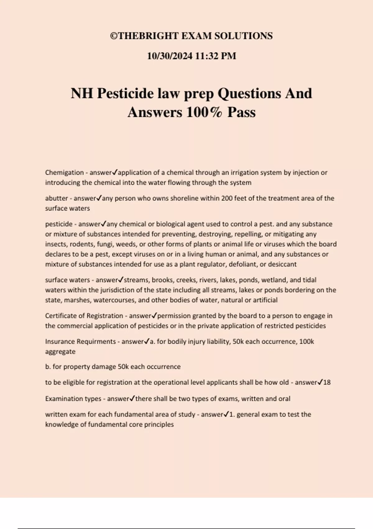 NH Pesticide law prep Questions And Answers 100% Pass Chemigation - answerapplication of a chemical through an irrigation system by injection or introducing the chemical into the water flowing through the system abutter - answerany person who owns shoreline within 200 feet of the treatment area of the surface waters pesticide - answerany chemical or biological agent used to control a pest. and any substance or mixture of substances intended for preventing, destroying, repelling, or mitigating any insects, rodents, fungi, weeds, or other forms of plants or animal life or viruses which the board declares to be a pest, except viruses on or in a living human or animal, and any substances or mixture of substances intended for use as a plant regulator, defoliant, or desiccant surface waters - answerstreams, brooks, creeks, rivers, lakes, ponds, wetland, and tidal waters within the jurisdiction of the state including all streams, lakes or ponds bordering on the state, marshes, watercourses, and other bodies of water, natural or artificial Certificate of Registration - answerpermission granted by the board to a person to engage in the commercial application of pesticides or in the private application of restricted pesticides Insurance Requirments - answera. for bodily injury liability, 50k each occurrence, 100k aggregate b. for property damage 50k each occurrence to be eligible for registration at the operational level applicants shall be how old - answer18 Examination types - answerthere shall be two types of exams, written and oral written exam for each fundamental area of study - answer1. general exam to test the knowledge of fundamental core principles