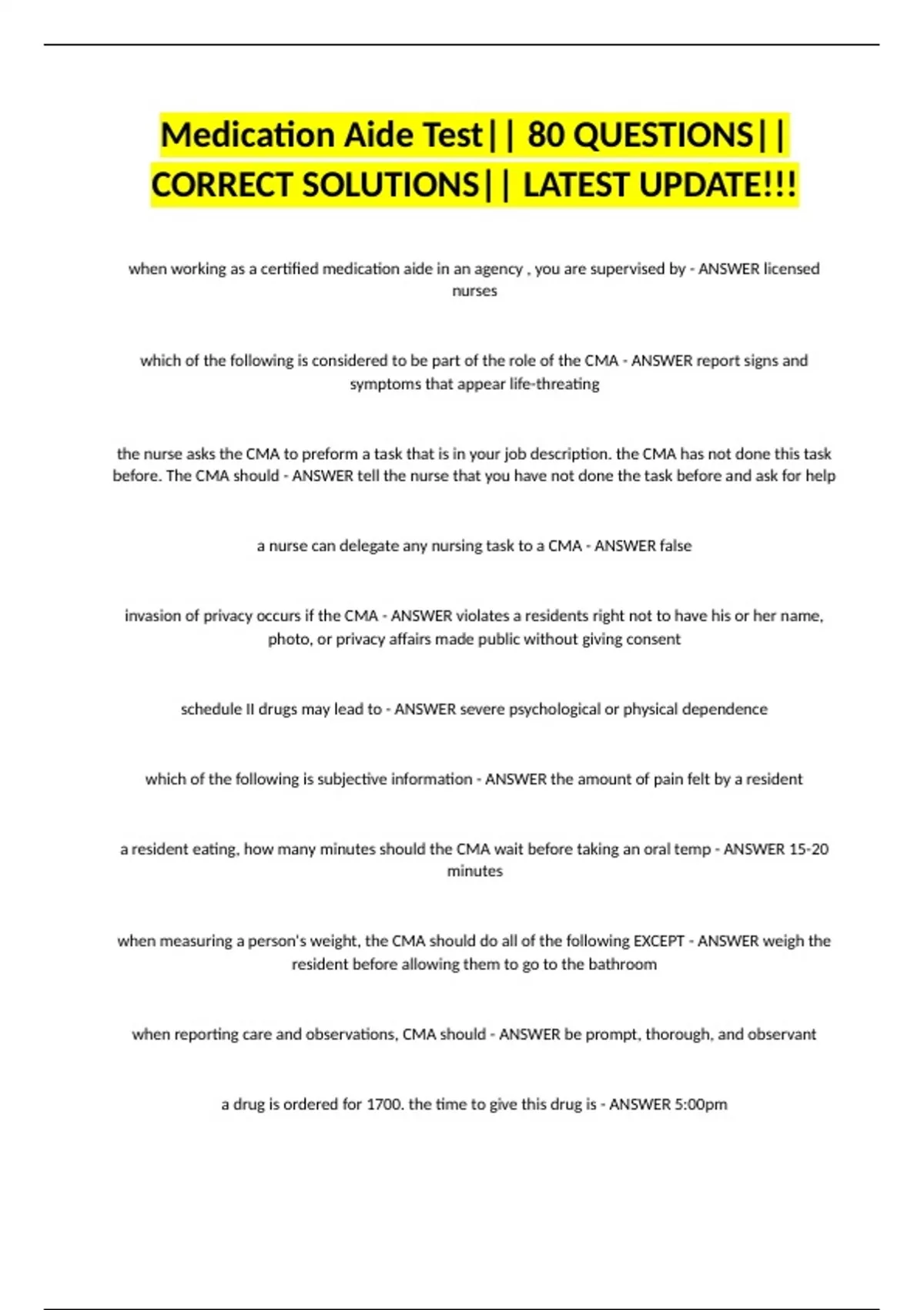 Medication Aide Test|| 80 QUESTIONS|| CORRECT SOLUTIONS|| LATEST UPDATE!!!