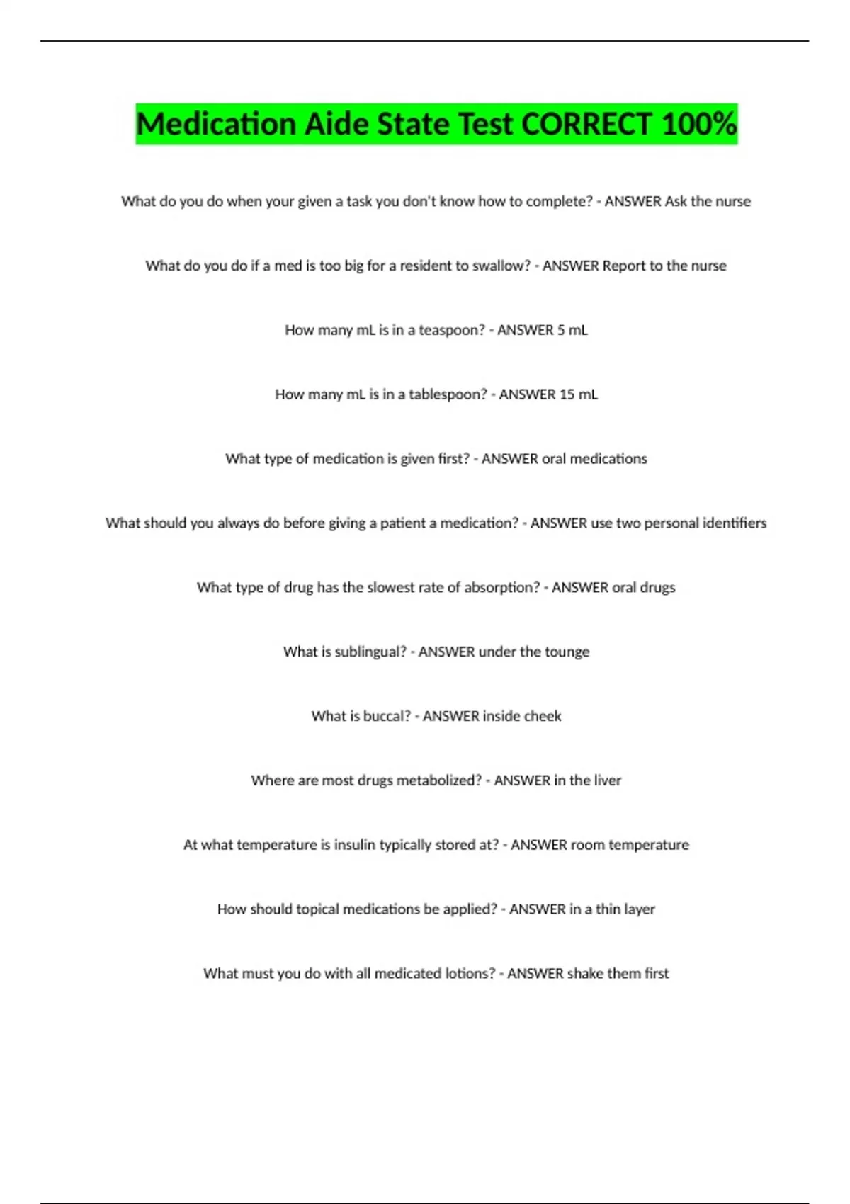 What do you do when your given a task you don't know how to complete? - ANSWER Ask the nurse What do you do if a med is too big for a resident to swallow? - ANSWER Report to the nurse How many mL is in a teaspoon? - ANSWER 5 mL How many mL is in a tablespoon? - ANSWER 15 mL