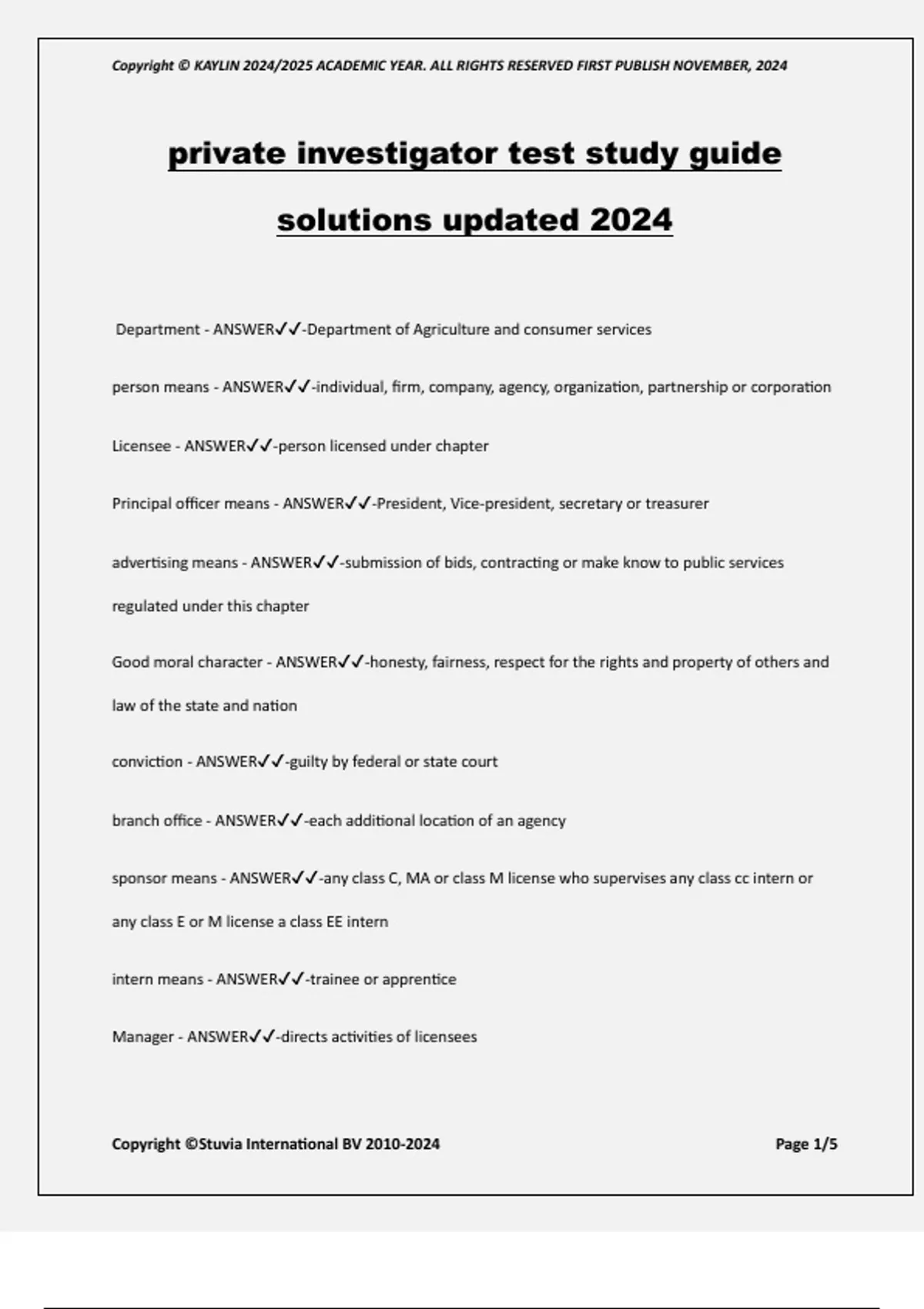 private investigator test study guide solutions updated 2024 Department - ANSWER-Department of Agriculture and consumer services person means - ANSWER-individual, firm, company, agency, organization, partnership or corporation Licensee - ANSWER-person licensed under chapter Principal officer means - ANSWER-President, Vice-president, secretary or treasurer advertising means - ANSWER-submission of bids, contracting or make know to public services regulated under this chapter Good moral character - ANSWER-honesty, fairness, respect for the rights and property of others and law of the state and nation conviction - ANSWER-guilty by federal or state court branch office - ANSWER-each additional location of an agency sponsor means - ANSWER-any class C, MA or class M license who supervises any class cc intern or any class E or M license a class EE intern intern means - ANSWER-trainee or apprentice Manager - ANSWER-directs activities of licensees Copyright © KAYLIN 2024/2025 ACADEMIC YEAR. ALL RIGHTS RESERVED FIRST PUBLISH NOVEMBER, 2024 Copyright ©Stuvia International BV Page 2/5 what must class C do to work in the state - ANSWER-Class C must own or be employed by a class A agency class AA or AB branch office subcontract (outside suppliers) - ANSWER-class C licensees may not do this intern has what license - ANSWER-Class CC who must intern be sponsored by - ANSWER-class C licensee, Class M or MA agency who must an intern work for - ANSWER-Class A agency what is a class A license - ANSWER-business licensed to conduct private investigation where is class A license valid - ANSWER-only 1 location who can a class A agency subcontract with - ANSWER-another class a agency does the owner of a class A agency need a MA manager lice