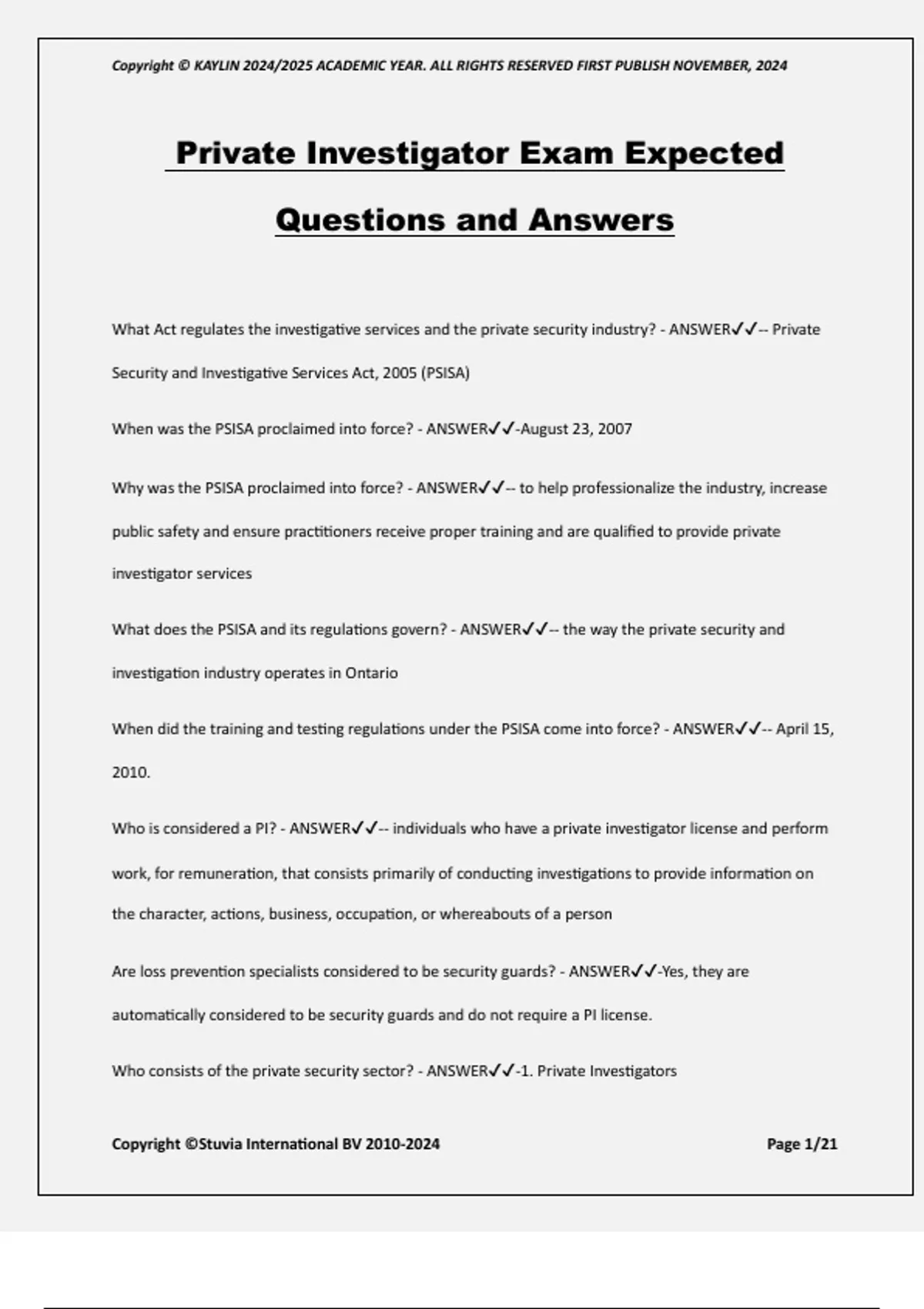 Private Investigator Exam Expected Questions and Answers What Act regulates the investigative services and the private security industry? - ANSWER-- Private Security and Investigative Services Act, 2005 (PSISA) When was the PSISA proclaimed into force? - ANSWER-August 23, 2007 Why was the PSISA proclaimed into force? - ANSWER-- to help professionalize the industry, increase public safety and ensure practitioners receive proper training and are qualified to provide private investigator services What does the PSISA and its regulations govern? - ANSWER-- the way the private security and investigation industry operates in Ontario When did the training and testing regulations under the PSISA come into force? - ANSWER-- April 15, 2010. Who is considered a PI? - ANSWER-- individuals who have a private investigator license and perform work, for remuneration, that consists primarily of conducting investigations to provide information on the character, actions, business, occupation, or whereabouts of a person Are loss prevention specialists considered to be security guards? - ANSWER-Yes, they are automatically considered to be security guards and do not require a PI license. Who consists of the private security sector? - ANSWER-1. Private Investigators Copyright © KAYLIN 2024/2025 ACADEMIC YEAR. ALL RIGHTS RESERVED FIRST PUBLISH NOVEMBER, 2024 Copyright ©Stuvia International BV Page 2/21 2. Loss prevention specialists 3. Mobile patrol services What are the two main divisions of the security industry? - ANSWER-- public & private What are the majority of tasks assigned that require a security guard to do? - ANSWER-- observe, deter, record and report In order to be eligible for a PI licence, what do all individuals have to do? - ANSWER-- complete the required training and/or testing - be 18 years old - possess a clean criminal record - be legally entitled to work in Canada What act regulates private investigators and security guards? - ANSWER-- the