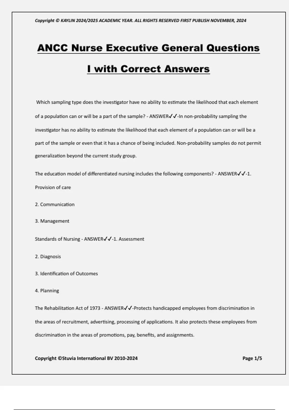 ANCC Nurse Executive General Questions I with Correct Answers Which sampling type does the investigator have no ability to estimate the likelihood that each element of a population can or will be a part of the sample? - ANSWER-In non-probability sampling the investigator has no ability to estimate the likelihood that each element of a population can or will be a part of the sample or even that it has a chance of being included. Non-probability samples do not permit generalization beyond the current study group. The education model of differentiated nursing includes the following components? - ANSWER-1. Provision of care 2. Communication 3. Management Standards of Nursing - ANSWER-1. Assessment 2. Diagnosis 3. Identification of Outcomes 4. Planning The Rehabilitation Act of 1973 - ANSWER-Protects handicapped employees from discrimination in the areas of recruitment, advertising, processing of applications. It also protects these employees from discrimination in the areas of promotions, pay, benefits, and assignments. Copyright © KAYLIN 2024/2025 ACADEMIC YEAR. ALL RIGHTS RESERVED FIRST PUBLISH NOVEMBER, 2024 Copyright ©Stuvia International BV Page 2/5 What are the 5 titles of the Americans with Disabilities Act of 1990? - ANSWER-1. Employment provisions. 2. Public transportation for disabled individuals. 3. Public access provisions for the disabled. 4. Transmitting and telecommunication devices. 5. Helps disabled individuals obtain a proper legal hearing in order to be compensated for damages caused by the lack of accessibility required in the preceding titles. Define Metamanagement - ANSWER-Metamanagement describes a cooperative effort of entrepreneurial or creative managers, strategic planners, and top m