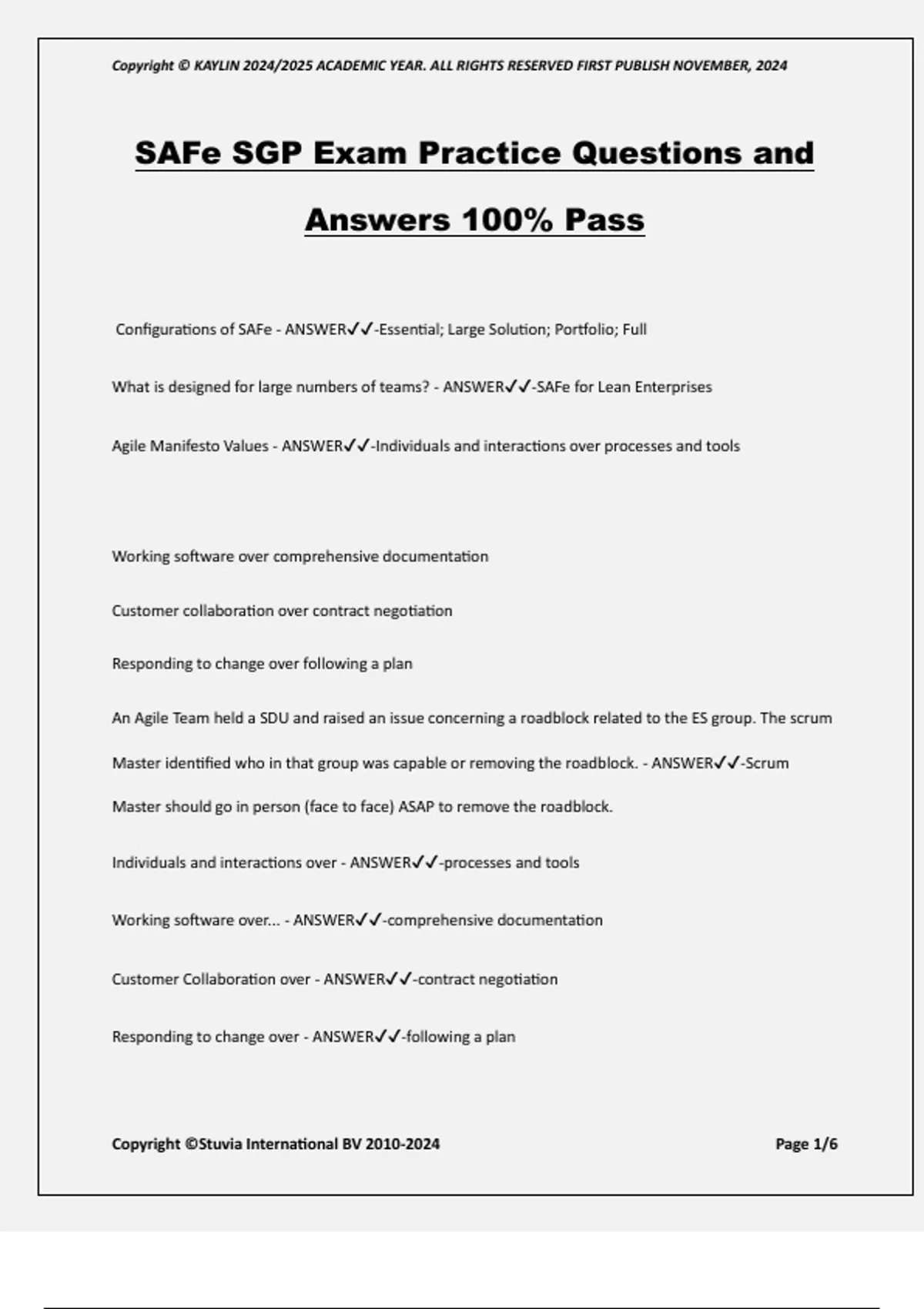 SAFe SGP Exam Practice Questions and Answers 100% Pass Configurations of SAFe - ANSWER-Essential; Large Solution; Portfolio; Full What is designed for large numbers of teams? - ANSWER-SAFe for Lean Enterprises Agile Manifesto Values - ANSWER-Individuals and interactions over processes and tools Working software over comprehensive documentation Customer collaboration over contract negotiation Responding to change over following a plan An Agile Team held a SDU and raised an issue concerning a roadblock related to the ES group. The scrum Master identified who in that group was capable or removing the roadblock. - ANSWER-Scrum Master should go in person (face to face) ASAP to remove the roadblock. Individuals and interactions over - ANSWER-processes and tools Working software over... - ANSWER-comprehensive documentation Customer Collaboration over - ANSWER-contract negotiation Responding to change over - ANSWER-following a plan Copyright © KAYLIN 2024/2025 ACADEMIC YEAR. ALL RIGHTS RESERVED FIRST PUBLISH NOVEMBER, 2024 Copyright ©Stuvia International BV Page 2/6 Which SAFe principle emphasizes Plan-Do-Check-Adjust (PDCA)? - ANSWER-Build incrementally with fast, integrated learning cycles What is a benefit of frequent integration points? - ANSWER-Faster Learning Why is it important to decentralize decision-making? - ANSWER-To enable team success without unnecessary delays How are silos overcome in a government setting? - ANSWER-Open and clear communication and collaboration. is it possible to create high-performing teams with a mixture of government and contractor personnel? - ANSWER-Yes, if government encourages and rewards team-centric behaviors An ART has teams from two different companies, as well as government teams. Once CTR team reports that the other CTR teams are withholding information vital to completing features. What must the GVT do? - ANSWER-Clarify expectations for cooperation and collaboration with ART members What do the teams that make up an Agile Release train do? - ANSWER-Align tp a common business and technology mission What is true about uncommitted objectives? - ANSWER-They are used to identify work that can vary within the scope of a PI Define ROAM: - ANSWER-Resolved - The teams agree that the ri