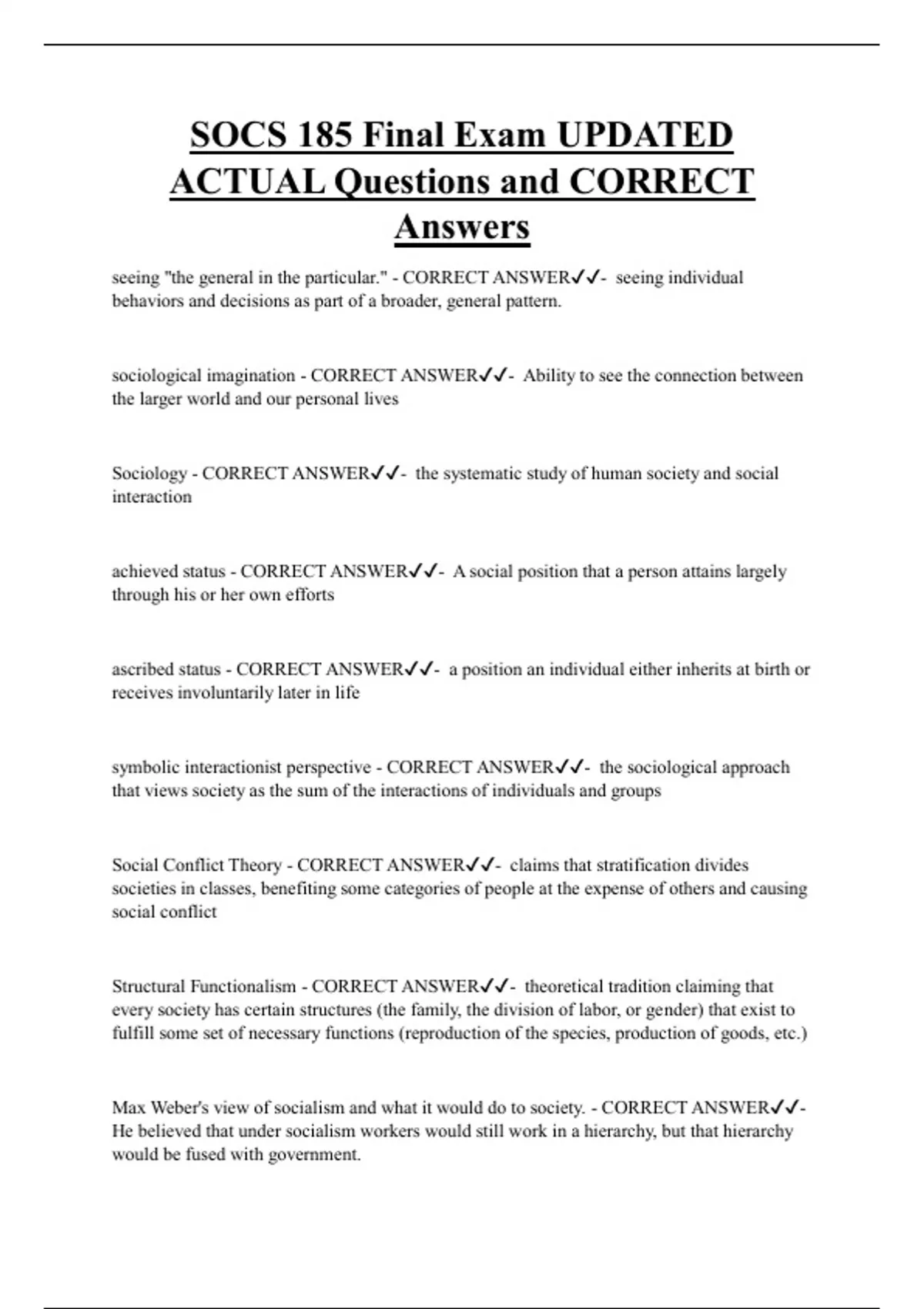 SOCS 185 Final Exam UPDATED ACTUAL Questions and CORRECT Answers seeing "the general in the particular." - CORRECT ANSWER- seeing individual behaviors and decisions as part of a broader, general pattern. sociological imagination - CORRECT ANSWER- Ability to see the connection between the larger world and our personal lives