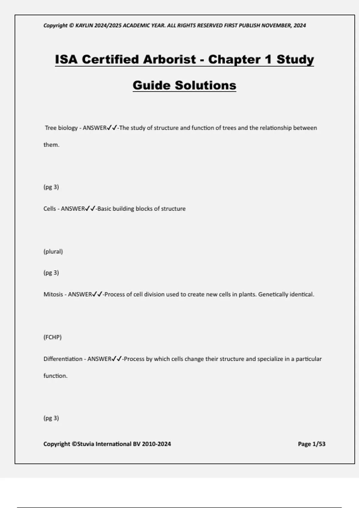 ISA Certified Arborist - Chapter 1 Study Guide Solutions Tree biology - ANSWER-The study of structure and function of trees and the relationship between them. (pg 3) Cells - ANSWER-Basic building blocks of structure (plural) (pg 3) Mitosis - ANSWER-Process of cell division used to create new cells in plants. Genetically identical. (FCHP) Differentiation - ANSWER-Process by which cells change their structure and specialize in a particular function. (pg 3) Copyright © KAYLIN 2024/2025 ACADEMIC YEAR. ALL RIGHTS RESERVED FIRST PUBLISH NOVEMBER, 2024 Copyright ©Stuvia International BV Page 2/53 Tissues - ANSWER-Cells grouped together with similar structure and function. (plural) (pg 3) Organs - ANSWER-Organized tissues that provides a particular function to the plant (plural) (pg 3) Leaves, Stems, Roots, Flowers, Fruit - ANSWER-What are the 5 organs of a tree: Format answer in the form of: ______, _____, _____, _______, _____ (plural) (pg 3) Organs, Tissues, Specialized Cells, Differentiation, Mitosis - ANSWER-Trees are composed of ______ Organs are made up of _______ Tissues are groups of ___________ ____ Specialized Cells are created via _______________ Copyright © KAYLIN 2024/2025 ACADEMIC YEAR. ALL RIGHTS RESERVED FIRST PUBLISH NOVEMBER, 2024 Copyright ©Stuvia International BV Page 3/53 Cells undergo Differentiation after they are created by the process of _______ Format answer in the form of: ______, _______, ___________ ____, _______________, _______ (plural) (pg 3, FCHP) Primary Growth - ANSWER-The type of growth occurring from Apical Meristems (pg 3) Primary Growth - ANSWER-The type of growth that results in the elongation of shoots and roots (pg 3) Apical Meristem - ANSWER-The meristem located at the tip of a shoot or a root. a.k.a. Primary Meristem (singular) (pg 4) Secondary Growth - ANSWER-The type of growth occurring from secondary meristems. Copyright © KAYLIN 2024/2025 ACADEMIC YEAR. ALL RIGHTS RESERVED FIRST PUBLISH NOVEMBER, 2024 Copyright ©Stuvia International BV Page 4/53 (pg 4) Secondary Growth - ANSWER-The type of growth that results in the widening / increase in diameter of stems, branches, and roots. (pg 4) Secondary Growth - ANSWER-The type of growth that produces the wood of trees (pg 3 & 4) Secondary Meristem - ANSWER-The type of meristem that produces Secondary Growth a.k.a Lateral Meristem (singular) (pg 3 & 4) Buds - ANSWER-House primary meristems in the shoots of a plant. Can be lateral or terminal. Can develop into a shoot or a flower (plural) (pg 4) Copyright © KAYLIN 2024/2025 ACADEMIC YEAR. ALL RIGHTS RESERVED FIRST PUBLISH NOVEMBER, 2024 Copyright ©Stuvia International BV Page 5/53 Stipules - ANSWER-Modified leaves (differing in function from true leaves) which serve to protect the buds meristematic region and any developing shoot growth (plural) (FCHP) Root Cap - ANSWER-Overlapping scales which help protect the apical meristem of roots (singular) (pg 4) Cambium - ANSWER-The first type of Secondary (lateral) Meristem (pg 4) Cambium - ANSWER-A thin sheath of dividing cells (region of mitosi