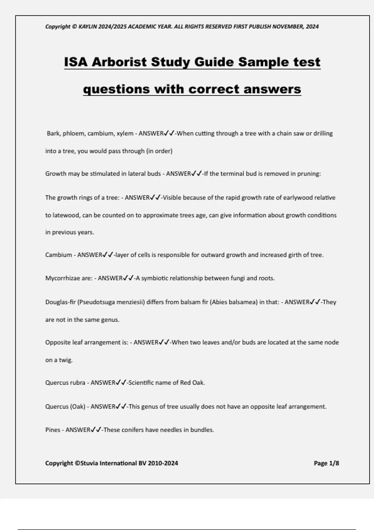 ISA Arborist Study Guide Sample test questions with correct answers Bark, phloem, cambium, xylem - ANSWER-When cutting through a tree with a chain saw or drilling into a tree, you would pass through (in order) Growth may be stimulated in lateral buds - ANSWER-If the terminal bud is removed in pruning: The growth rings of a tree: - ANSWER-Visible because of the rapid growth rate of earlywood relative to latewood, can be counted on to approximate trees age, can give information about growth conditions in previous years. Cambium - ANSWER-layer of cells is responsible for outward growth and increased girth of tree. Mycorrhizae are: - ANSWER-A symbiotic relationship between fungi and roots. Douglas-fir (Pseudotsuga menziesii) differs from balsam fir (Abies balsamea) in that: - ANSWER-They are not in the same genus. Opposite leaf arrangement is: - ANSWER-When two leaves and/or buds are located at the same node on a twig. Quercus rubra - ANSWER-Scientific name of Red Oak. Quercus (Oak) - ANSWER-This genus of tree usually does not have an opposite leaf arrangement. Pines - ANSWER-These conifers have needles in bundles. Copyright © KAYLIN 2024/2025 ACADEMIC YEAR. ALL RIGHTS RESERVED FIRST PUBLISH NOVEMBER, 2024 Copyright ©Stuvia International BV Page 2/8 Available oxygen and water - ANSWER-The primary factor in controlling the depth, spread, and distribution of tree roots in the soil is/are: The most fibrous and absorptive portion of a tree's root system is found in? - ANSWER-Are in the upper 6 inches of soil. Water will drain very slowly out of the planting hole. - ANSWER-If a planting hole in a clay soil site is backfilled with sandy soil. When soil is compacted: - ANSWER-Total pore space and the percentage of macropores are reduced. A characteristic of sandy soils in arid regions is: - ANSWER-They tend to become alkaline, and salts build up due to the lack of heavy rainfall. When irrigating trees: - ANSWER-Infrequent, deep soakings are prefera