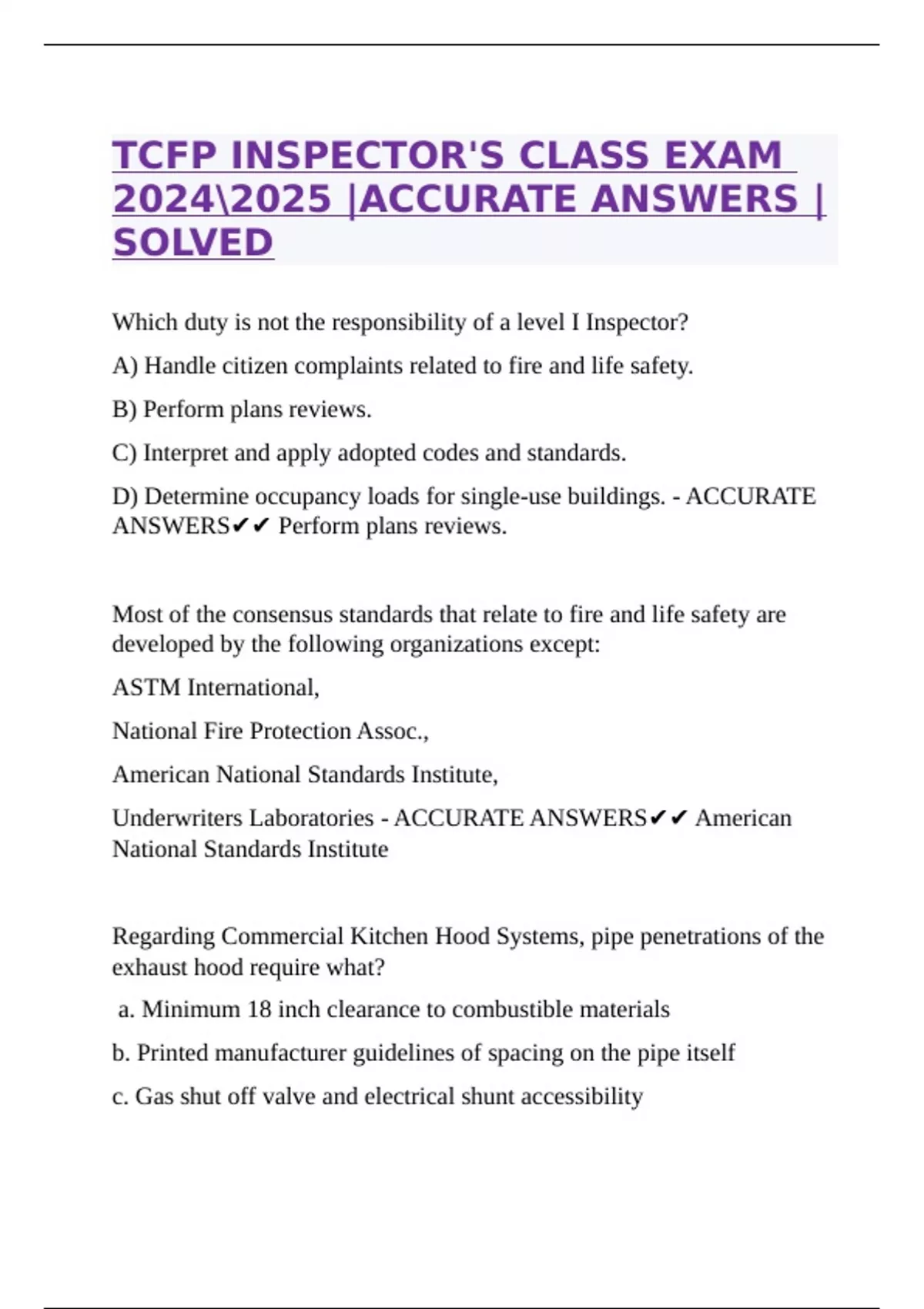 Which duty is not the responsibility of a level I Inspector? A) Handle citizen complaints related to fire and life safety. B) Perform plans reviews. C) Interpret and apply adopted codes and standards. D) Determine occupancy loads for single-use buildings. - ACCURATE ANSWERS Perform plans reviews. Most of the consensus standards that relate to fire and life safety are developed by the following organizations except: ASTM International, National Fire Protection Assoc., American National Standards Institute, Underwriters Laboratories - ACCURATE ANSWERS American National Standards Institute Regarding Commercial Kitchen Hood Systems, pipe penetrations of the exhaust hood require what? a. Minimum 18 inch clearance to combustible materials b. Printed manufacturer guidelines of spacing on the pipe itself c. Gas shut off valve and electrical shunt accessibility d. A liquid tight continuous external weld - ACCURATE ANSWERS A liquid tight continuous external weld