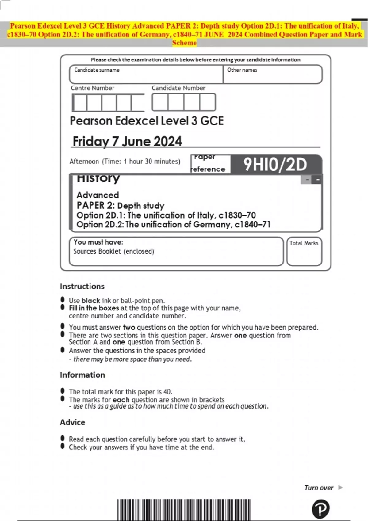 Pearson Edexcel Level 3 GCE History Advanced PAPER 2: Depth study Option 2D.1: The unification of Italy, c1830–70 Option 2D.2: The unification of Germany, c1840–71 JUNE 2024 Combined Question Paper and Mark Scheme