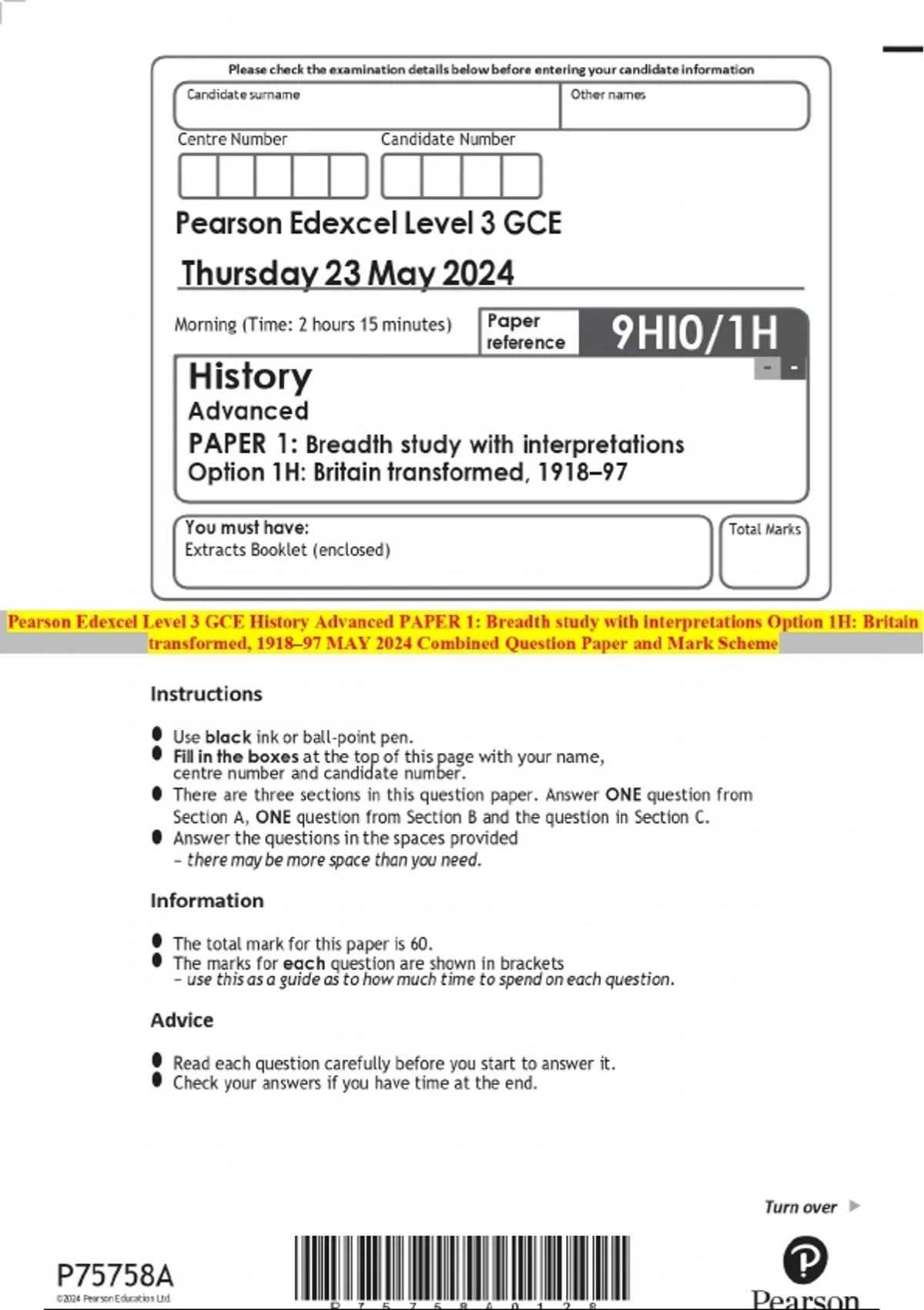 Pearson Edexcel Level 3 GCE History Advanced PAPER 1: Breadth study with interpretations Option 1H: Britain transformed, 1918–97 MAY 2024 Combined Question Paper and Mark Scheme