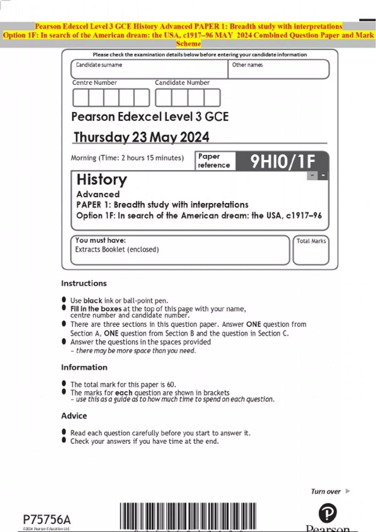 Pearson Edexcel Level 3 GCE History Advanced PAPER 1: Breadth study with interpretations Option 1F: In search of the American dream: the USA, c1917–96 MAY 2024 Combined Question Paper and Mark Scheme