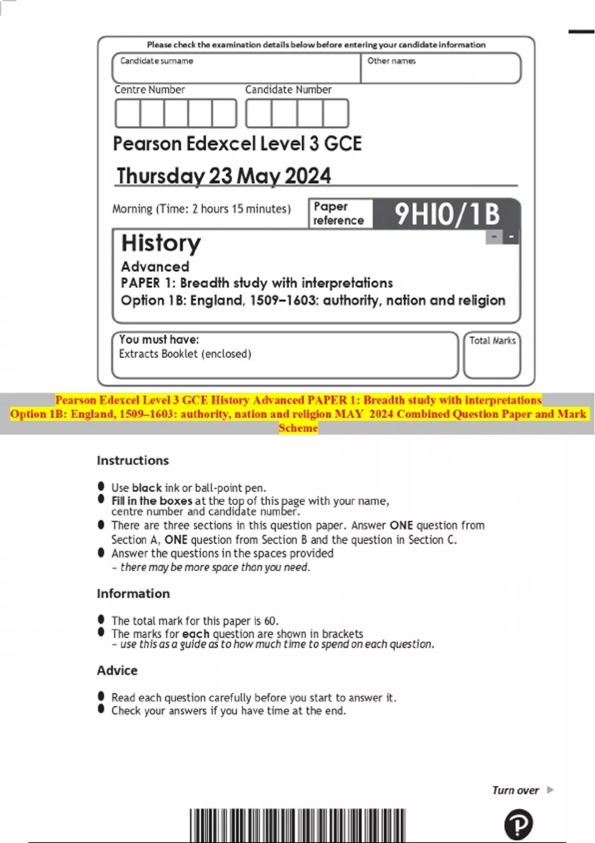 Pearson Edexcel Level 3 GCE History Advanced PAPER 1: Breadth study with interpretations Option 1B: England, 1509–1603: authority, nation and religion MAY 2024 Combined Question Paper and Mark Scheme