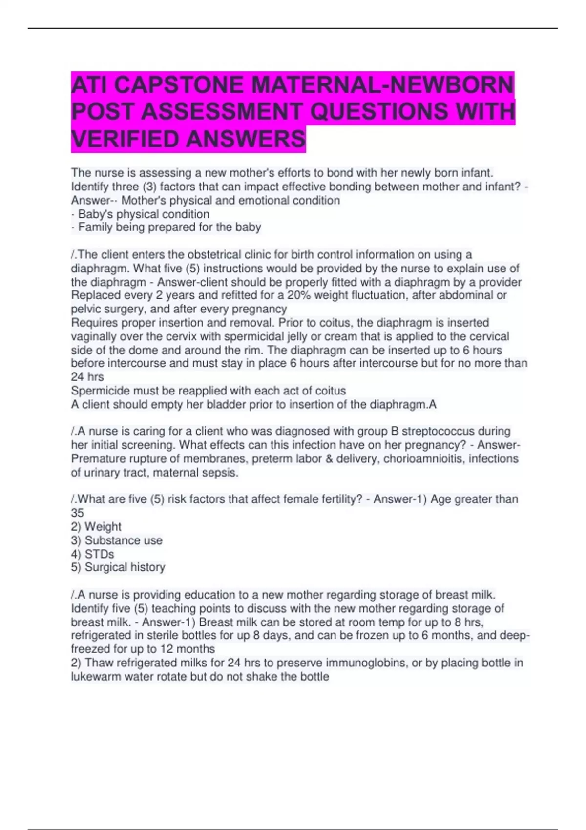 ATI CAPSTONE MATERNAL-NEWBORN POST ASSESSMENT QUESTIONS WITH VERIFIED ANSWERS The nurse is assessing a new mother's efforts to bond with her newly born infant. Identify three (3) factors that can impact effective bonding between mother and infant? - Answer-• Mother's physical and emotional condition • Baby's physical condition • Family being prepared for the baby /.The client enters the obstetrical clinic for birth control information on using a diaphragm. What five (5) instructions would be provided by the nurse to explain use of the diaphragm - Answer-client should be properly fitted with a diaphragm by a provider Replaced every 2 years and refitted for a 20% weight fluctuation, after abdominal or pelvic surgery, and after every pregnancy Requires proper insertion and removal. Prior to coitus, the diaphragm is inserted vaginally over the cervix with spermicidal jelly or cream that is applied to the cervical side of the dome and around the rim. The diaphragm can be inserted up to 6 hours before intercourse and must stay in place 6 hours after intercourse but for no more than 24 hrs Spermicide must be reapplied with each act of coitus A client should empty her bladder prior to insertion of the diaphragm.A /.A nurse is caring for a client who was diagnosed with group B streptococcus during her initial screening. What effects can this infection have on her pregnancy? - Answer-Premature rupture of membranes, preterm labor & delivery, chorioamnioitis, infections of urinary tract, maternal sepsis. /.What are five (5) risk factors that affect female fertility? - Answer-1) Age greater than 35 2) Weight 3) Substance use 4) STDs 5) Surgical history /.A nurse is providing education to a new mother regarding storage of breast milk. Identify five (5) teaching points to discuss with the new mother regarding storage of breast milk. - Answer-1) Breast milk can be stored at room temp for up to 8 hrs, refrigerated in sterile bottles for up 8 days, and can be frozen up to 6 months, and deep-freezed for up to 12 months 2) Thaw refrigerated milks for 24 hrs to preserve immunoglobins, or by placing bottle in lukewarm water rotate but do not shake the bottle