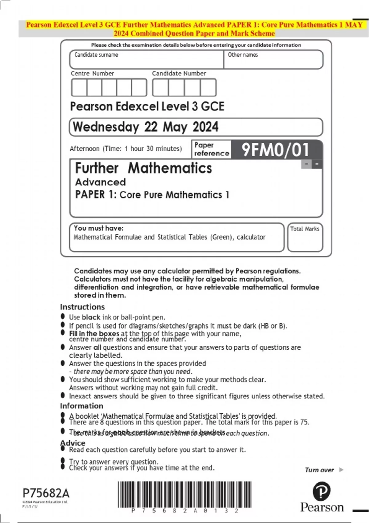 Pearson Edexcel Level 3 GCE Further Mathematics Advanced PAPER 1: Core Pure Mathematics 1 MAY 2024 Combined Question Paper and Mark Scheme