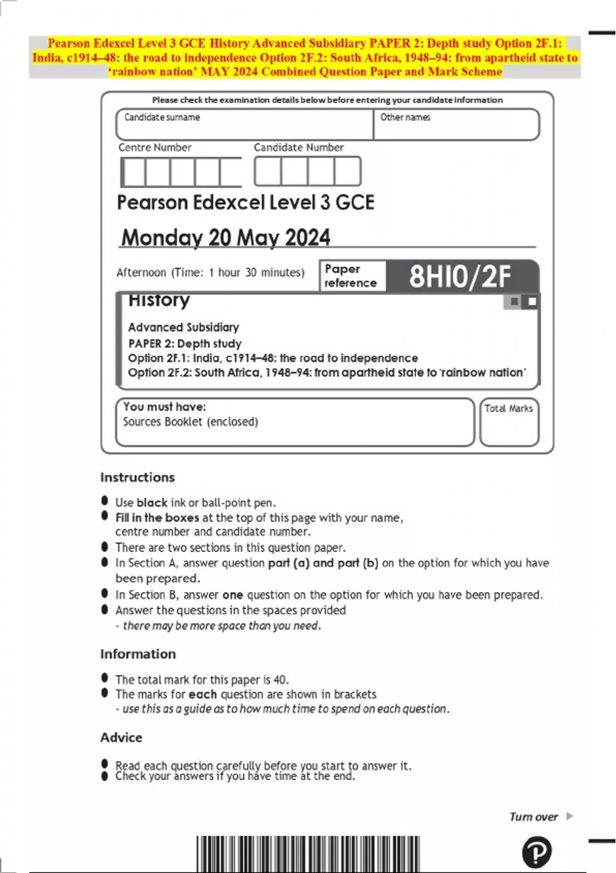 Pearson Edexcel Level 3 GCE History Advanced Subsidiary PAPER 2: Depth study Option 2F.1: India, c1914–48: the road to independence Option 2F.2: South Africa, 1948–94: from apartheid state to ‘rainbow nation’ MAY 2024 Combined Question Paper and Mark Sche