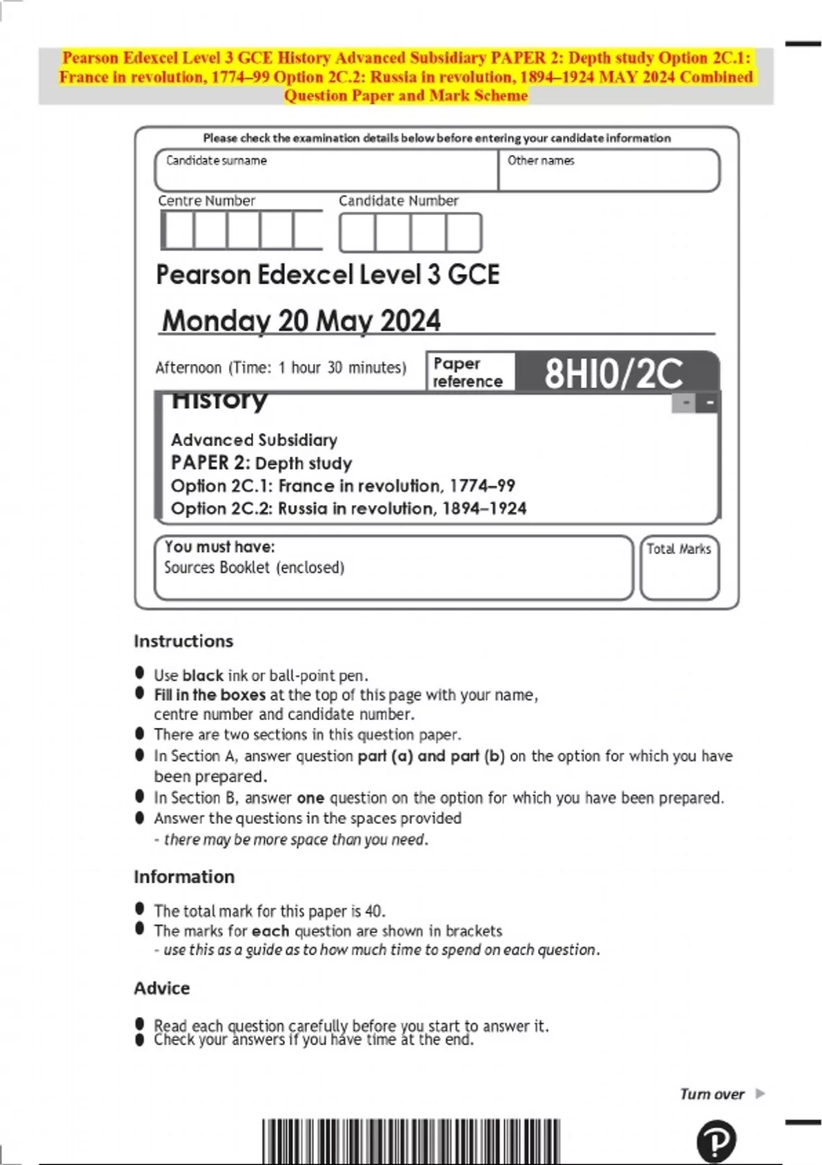 Pearson Edexcel Level 3 GCE History Advanced Subsidiary PAPER 2: Depth study Option 2C.1: France in revolution, 1774–99 Option 2C.2: Russia in revolution, 1894–1924 MAY 2024 Combined Question Paper and Mark Scheme