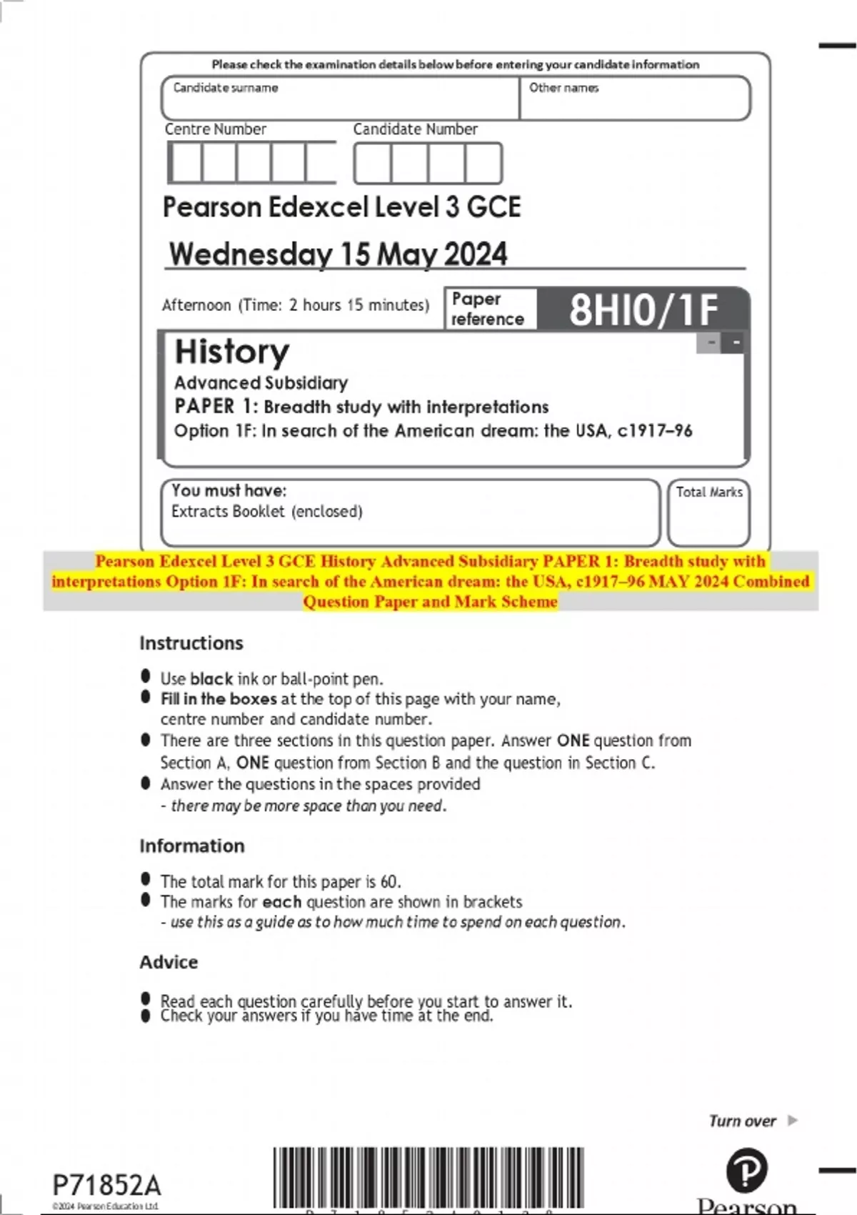 Pearson Edexcel Level 3 GCE History Advanced Subsidiary PAPER 1: Breadth study with interpretations Option 1F: In search of the American dream: the USA, c1917–96 MAY 2024 Combined Question Paper and Mark Scheme